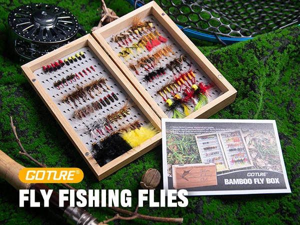 Goture 115 Uds. Surtido de moscas de pesca con mosca hechas a mano con caja de bambú, serpentín de moscas secas/húmedas para trucha, lubina, cebo de señuelo de pesca