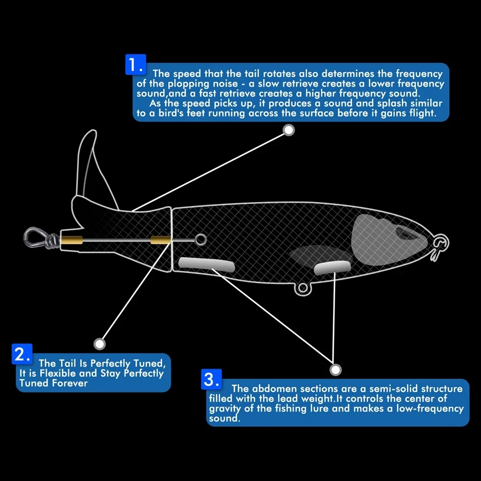 hace que el extremo posterior gire creando una turbulencia en el agua similar a un zumbido de cebo, creando ruido