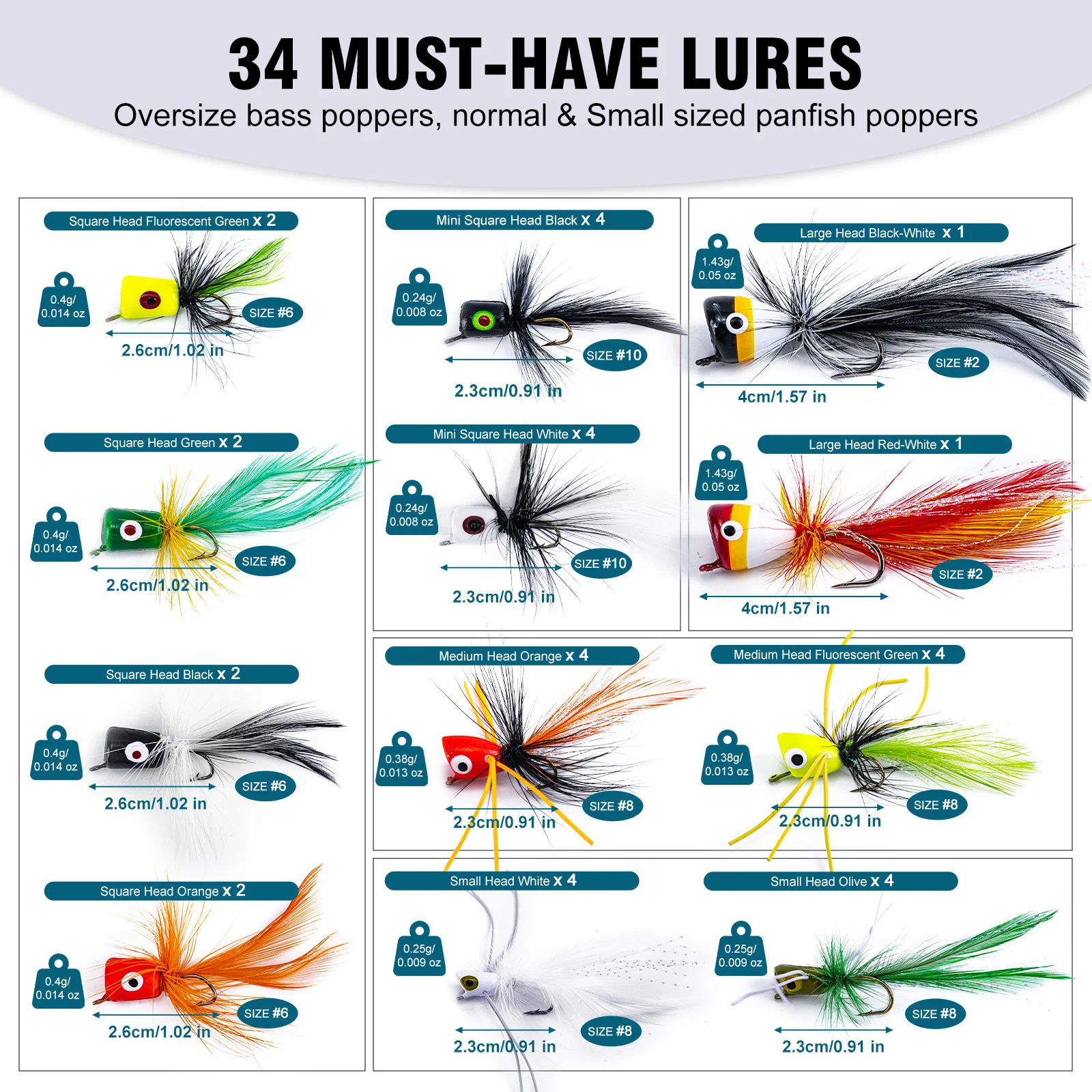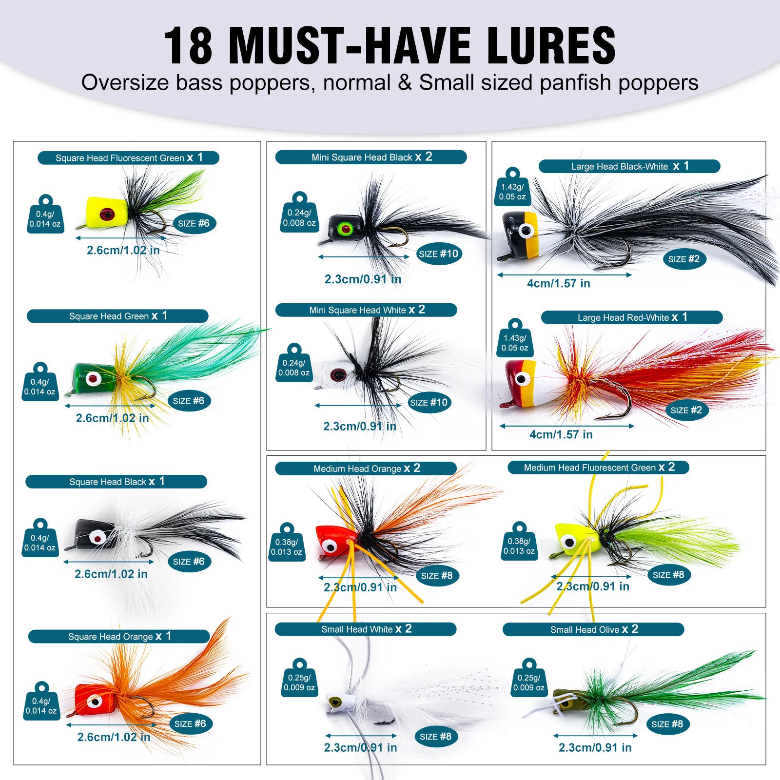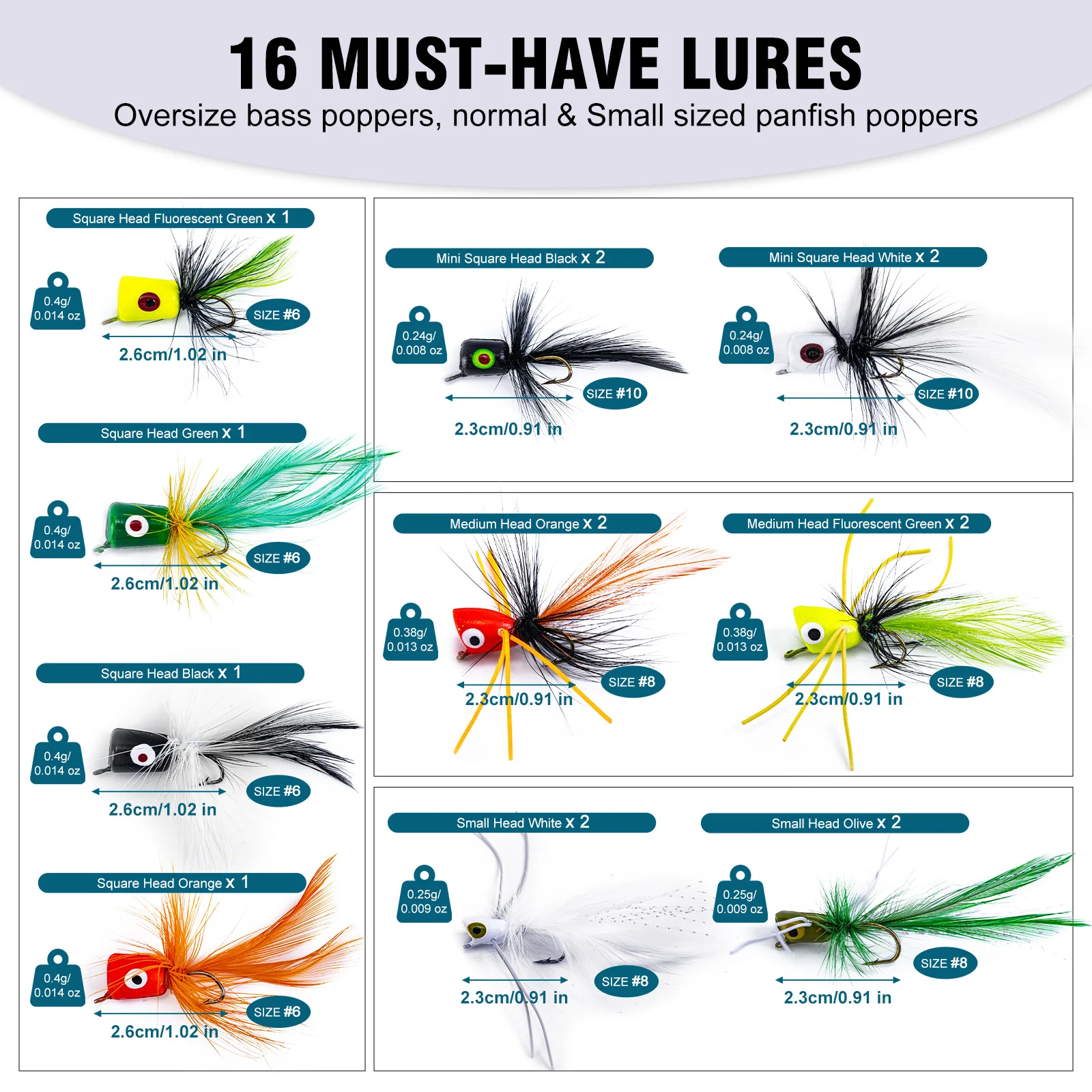 Hay 16 hojuelas poppers y 30 moscas secas/húmedas disponibles, que pueden satisfacer sus necesidades diarias de pesca.También puedes compartir con tus amigos.Es un excelente kit de moscas para pesca con mosca tanto para principiantes como para pescadores experimentados.