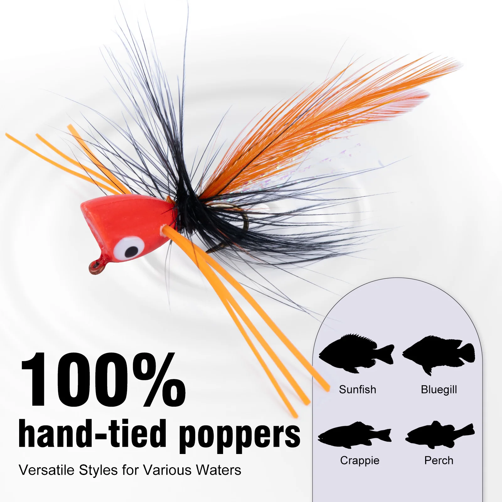 Los señuelos popper están diseñados como moscas heridas cuelgando en el agua.Una ligera contracción del hilo de pescar hace que estos poppers de panfish sean más animados, como las moscas reales que se apoyan sobre la superficie del agua, lo que puede atraer fácilmente la atención de los peces.
