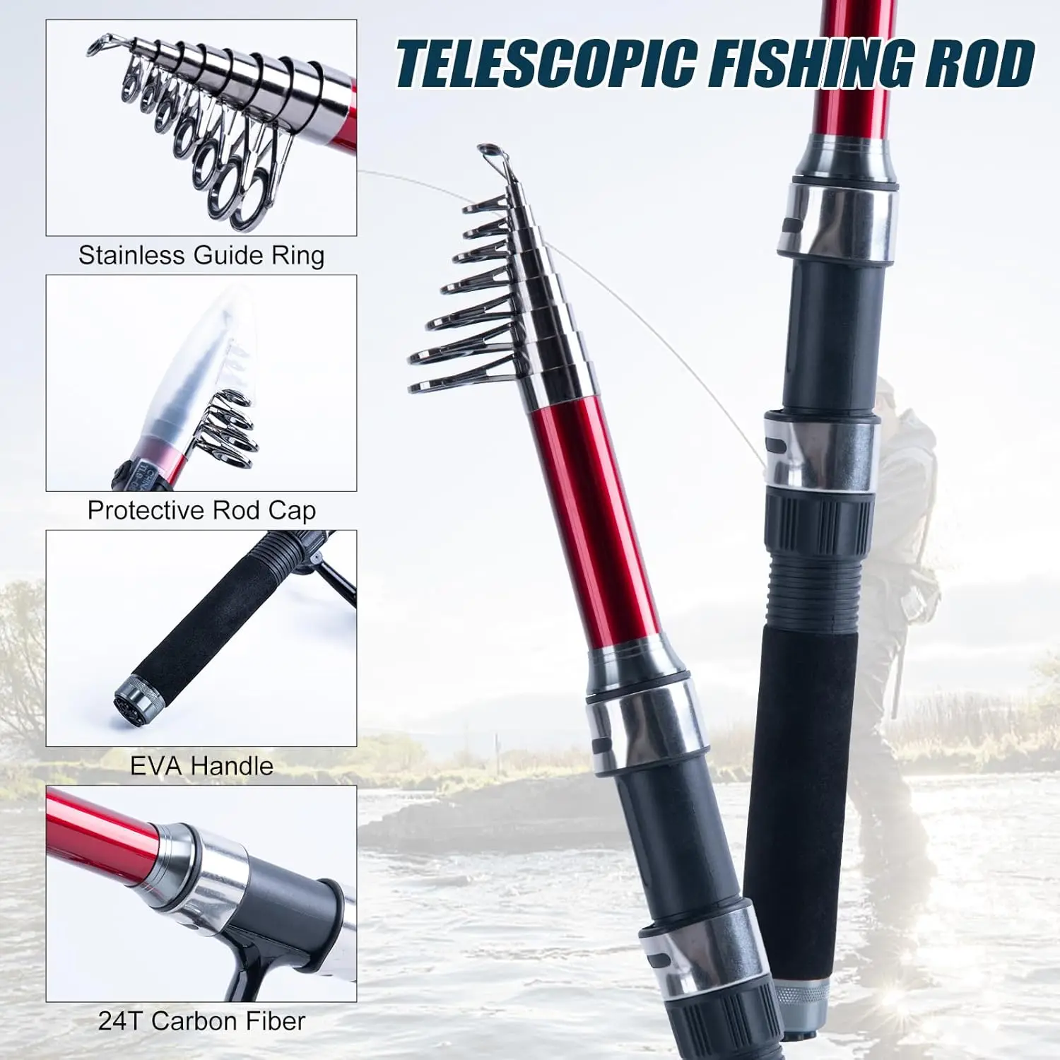 Caña de pescar telescópica liviana: la caña telescópica está fabricada con fibra de carbono de alta densidad mezclada con fibra de vidrio, que es liviana, fuerte y resistente.El mango de EVA adopta un diseño ergonómico para hacerlo cómodo y antideslizante.La caña de pescar telescópica es portátil y el diseño de longitud cerrada es cómodo de transportar.