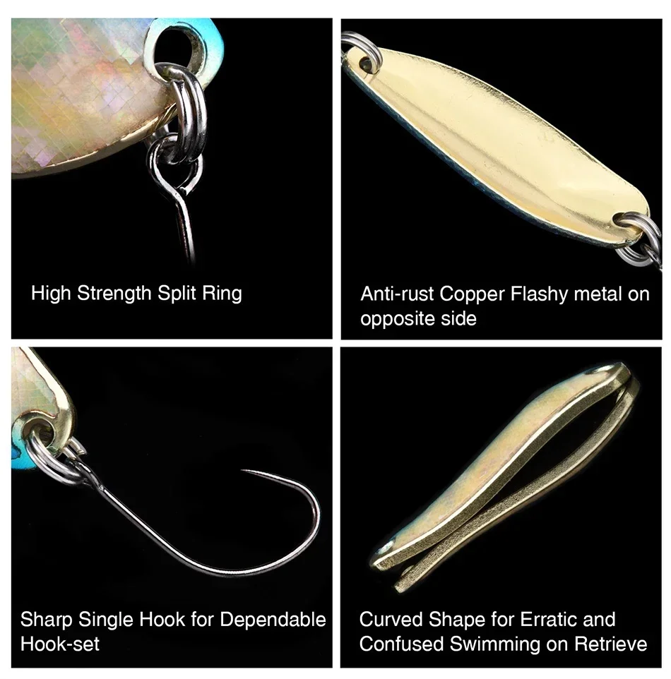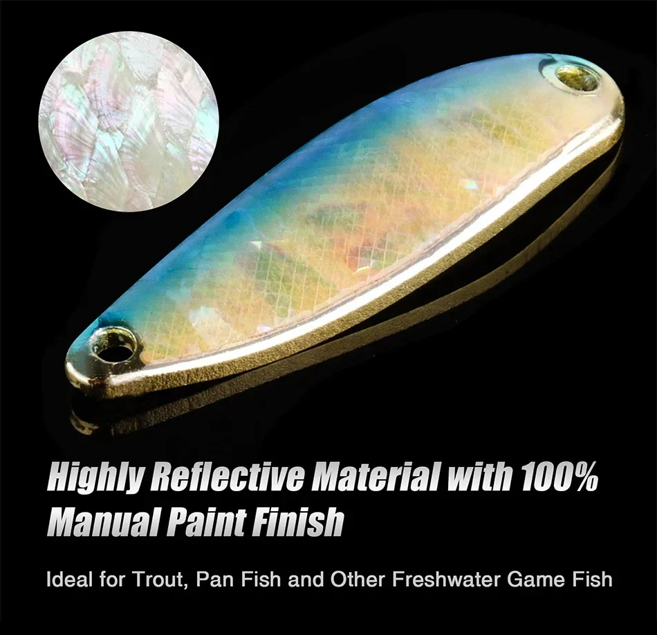 Característica:【Material premium】El señuelo de cuchara está fabricado en latón de alta calidad con pinturas de colores.Mejoró un revestimiento transparente ultrabrillante, es anticorrosión, resistente a caídas de pintura y de uso duradero.【Atractivo señuelo de cuchara reflectante】Los señuelos de cuchara de pesca cuentan con una capa reflectante brillante que llamarán la atención de la trucha, el panfish, el bluegill, el tipo de pez y otros peces de agua dulce incluso en aguas oscuras y embarradas.【Diseño de acción de natación realista】Los señuelos de cuchara mininow simulan una acción de natación de peces reales y se sumergen rápidamente en el agua.Crea una línea especial de hundimiento de deriva libre mientras se corra.La oscilación única envía vibraciones a través del agua para atraer a los peces de caza a morder.【Gancho afilado con púas】Anzuelo único de acero con alto contenido de carbono, afilado pero resistente, que le ayuda a capturar más peces fácilmente y no los matará rápidamente.Práctico lazo de apertura para reemplazar fácilmente el anzuelo de pesca.【Perfecto para lanzamientos largos】El diseño de forma única puede reducir eficazmente la resistencia al viento y facilitar el acceso rápido a la zona de golpe.No torcerá, engarzará ni debilitará el hilo de pescar.Señuelo de cuchara ideal para lanzamientos largos.【Amplia aplicación】Ampliamente utilizado en todo tipo de pesca, como pesca en el mar, pesca en río, pesca en lago, pesca en agua salada, pesca en agua dulce, pesca en roca, pesca en barco, pesca en hielo.Regalo perfecto para todos los pescadores.El paquete incluye: