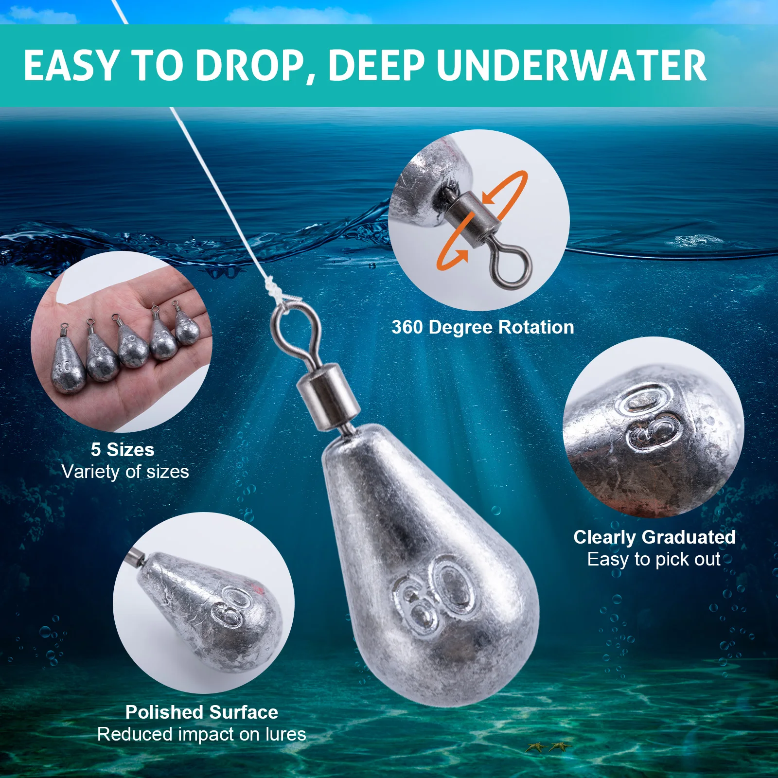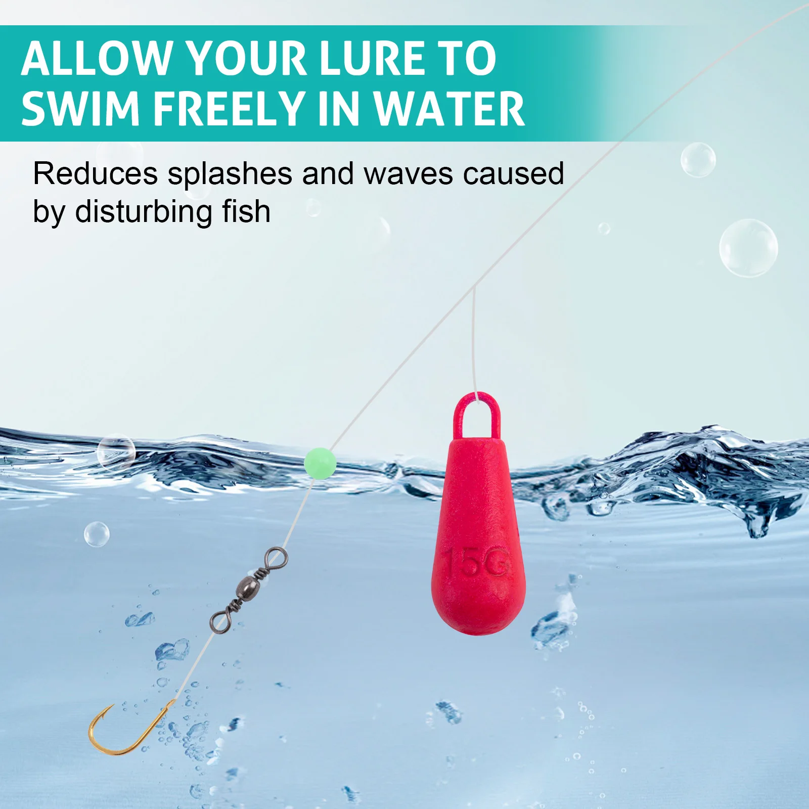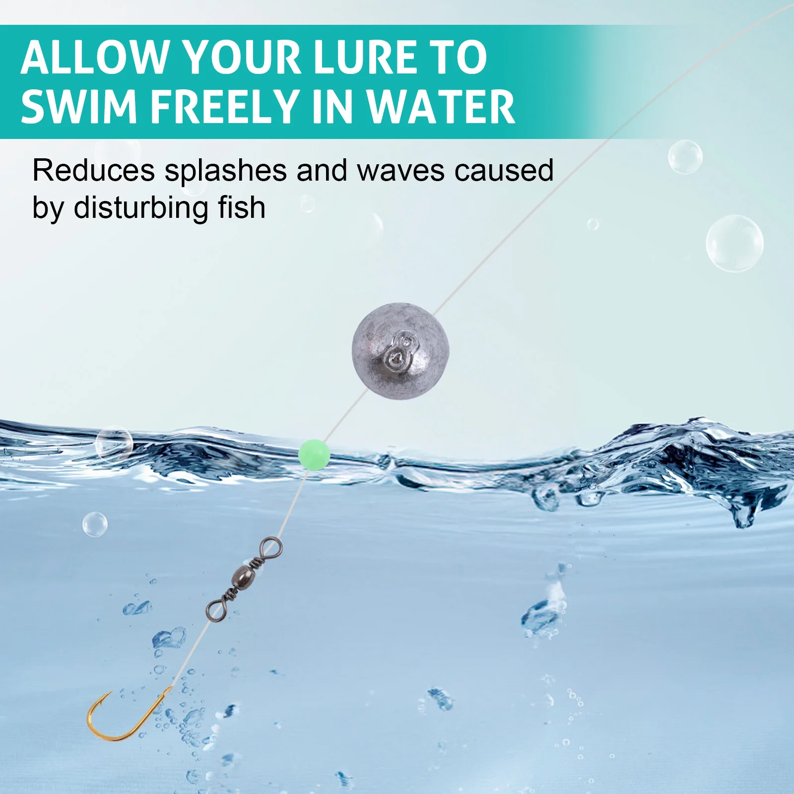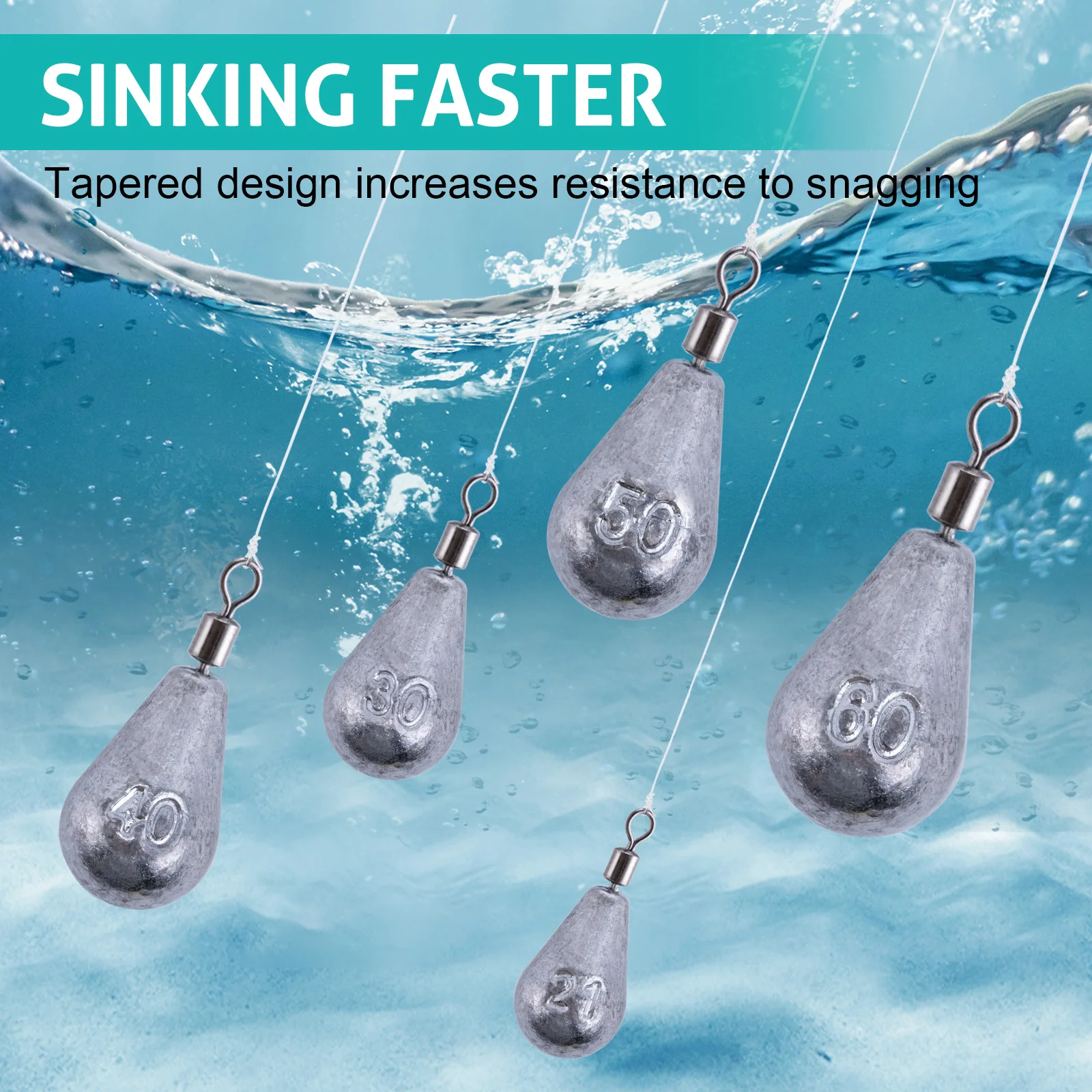 Estos pesos de pesca están diseñados para hundirse rápidamente, lo que los hace ideales para la pesca de fondo, especialmente para especies como bagre, carpa y lubina.La rápida tasa de hundimiento le ayuda a apuntar a los peces que viven el fondo, mejorando sus posibilidades de capturar.