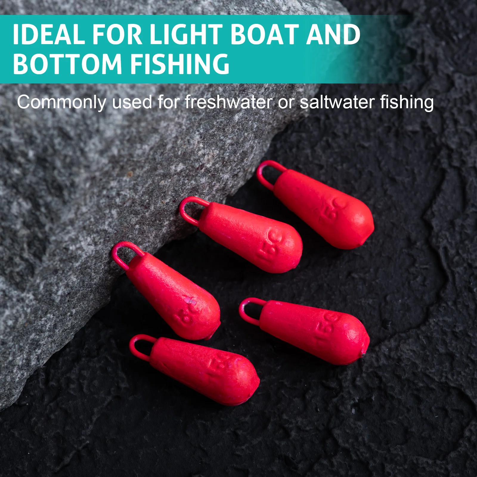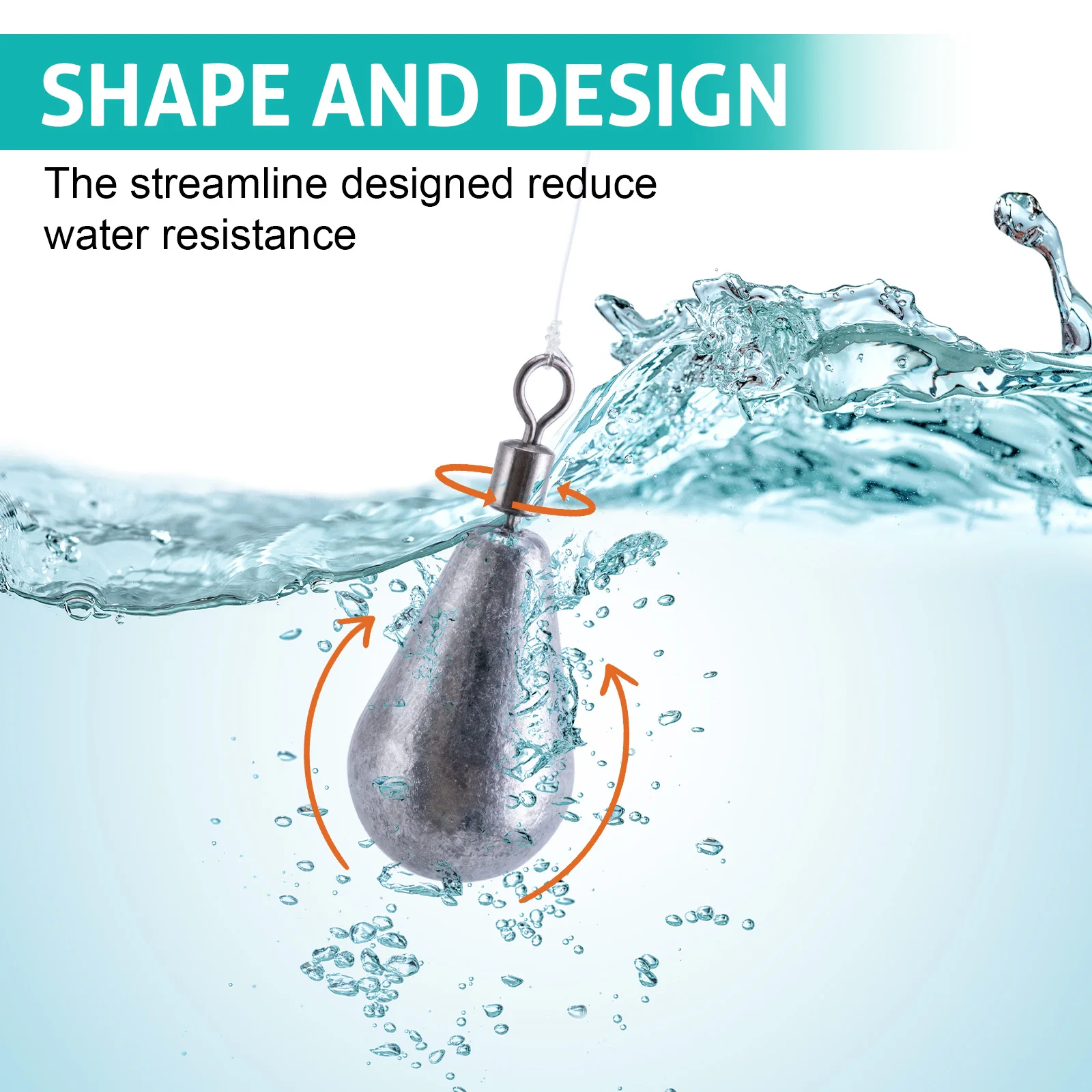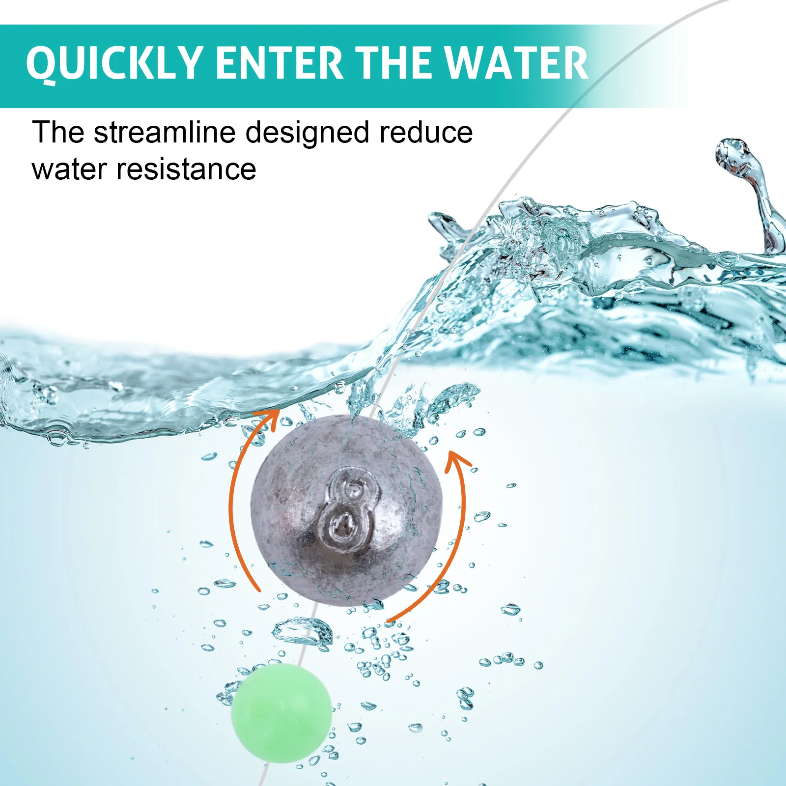 El diseño aerodinámico y en forma de gota reduce la resistencia al agua, lo que hace que los lanzamientos sean más suaves y más largos.Los bordes redondeados también ayudan a prevenir enganches en el fondo, lo que le permite pescar con menos interrupciones.