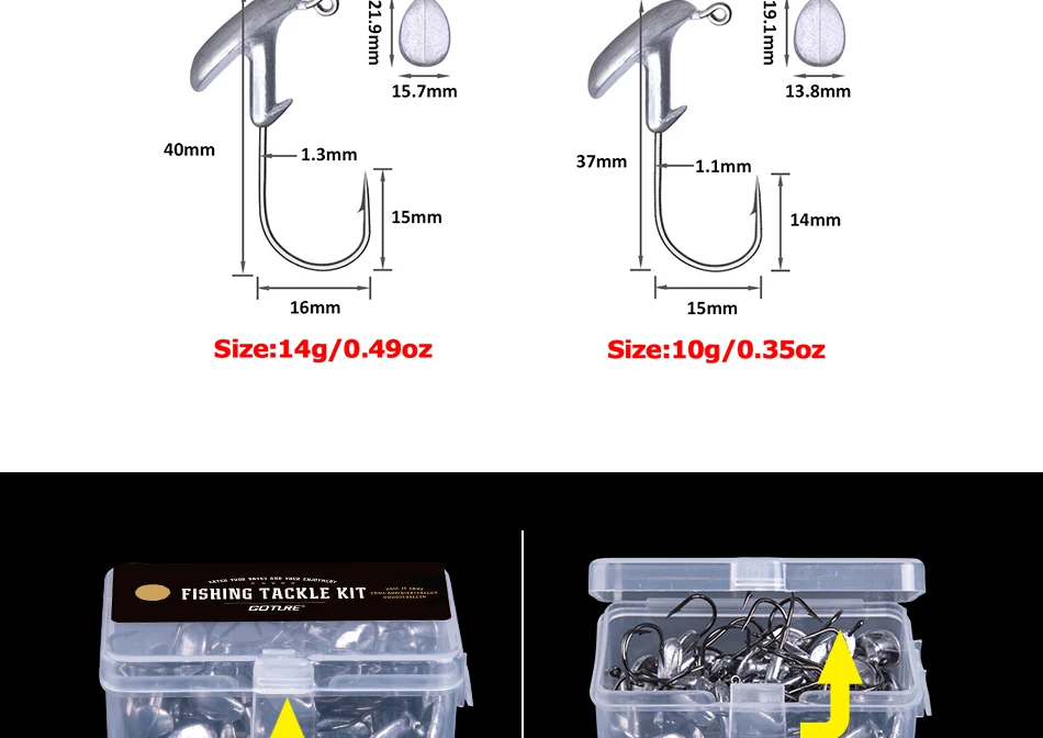 Goture Stand Up Jig Head Hook Tumbler Anzuelos de pesca, 3,5G 5G 7G 10g 14g Anzuelo de cabeza de plomo para pescar trucha salmón lubina + caja de señuelos