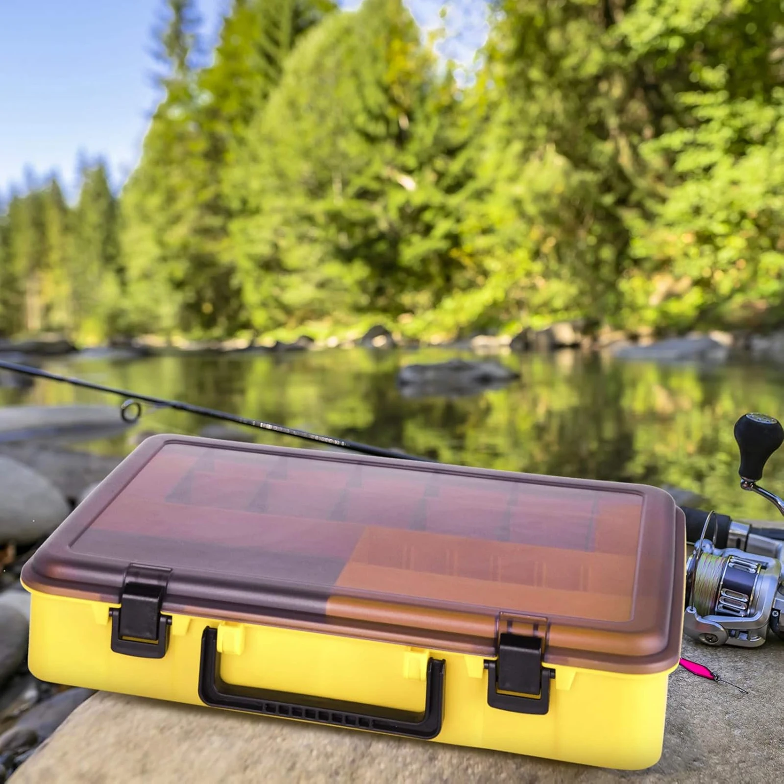 RESISTENCIA A LOS IMPACTOS; El material principal de la caja está hecho de resina de polipropileno. El grosor de la carcasa es 0,1 pulgadas más grueso que el mismo tipo de producto. La carcasa exterior puede soportar 300 libras de presión e impacto. Está diseñado para las características de la caja de engranajes de pesca y no se daña fácilmente con metales afilados como anzuelos y arañazos.