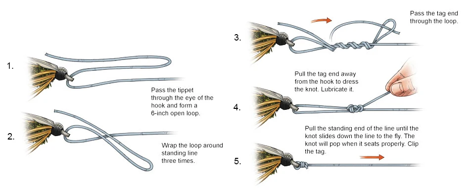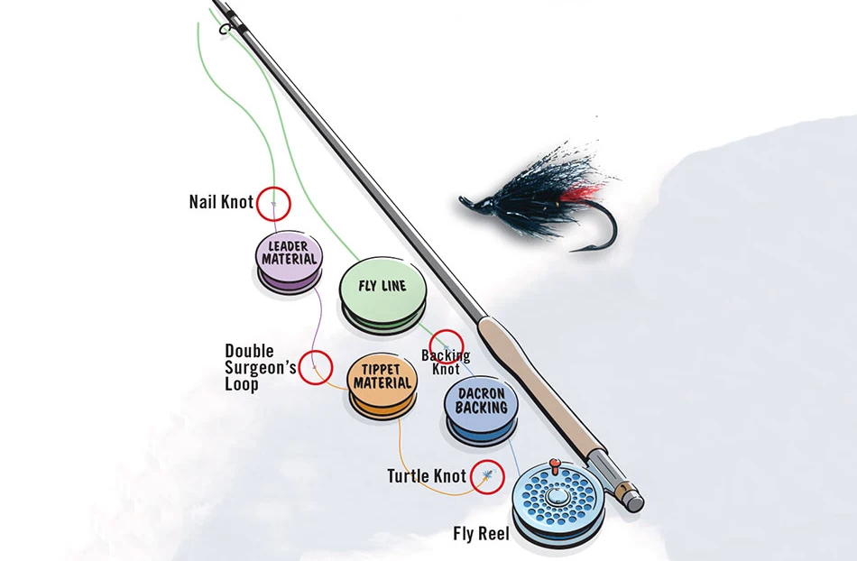 ¿Cómo configurar la caña de mosca, el carrete, la línea y el gancho?