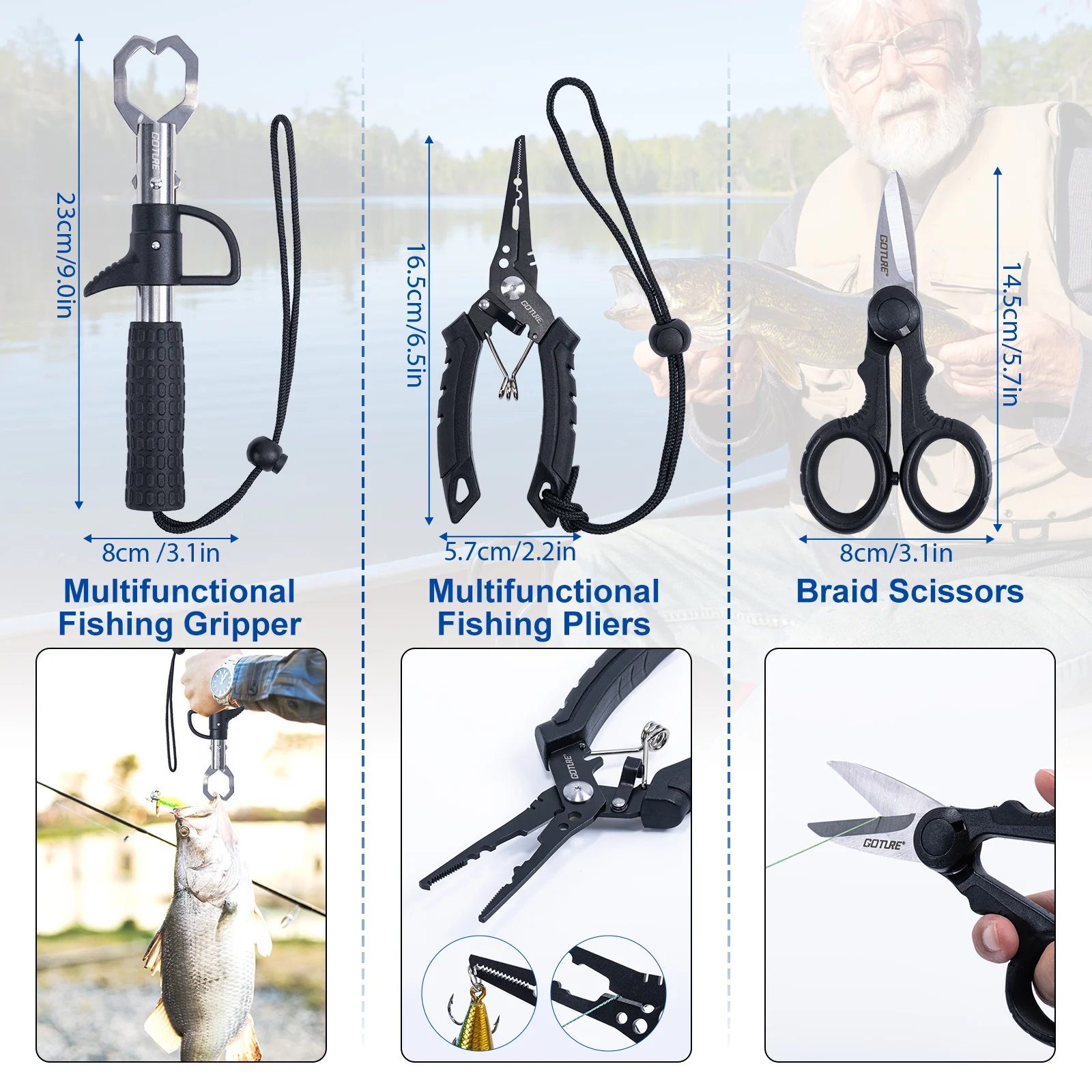 Accesorios esenciales: Las tijeras de forma única ofrecen un corte nítido y preciso para líneas de pesca estándar.Los alicates para señuelos multifuncionales son perfectos para quitar anzuelos, abrir anillos divididos y cortar líneas.La pinza para peces cuenta con bucles de mango doble para un agarre más fuerte, con una mandíbula de acero inoxidable para una mayor durabilidad.