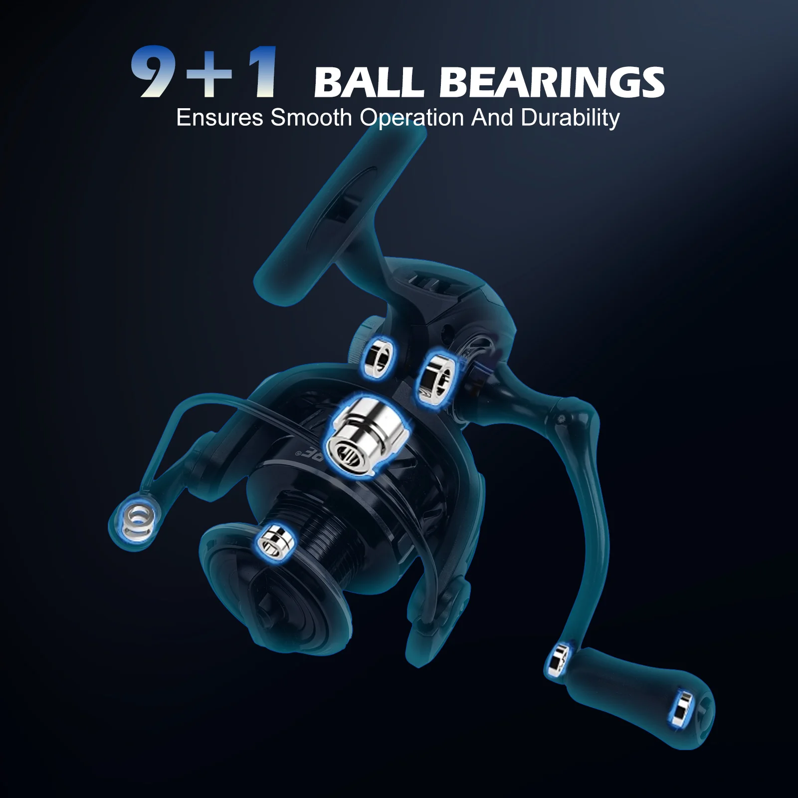 Carrete giratorio con rodamiento de bolas suave 9+1: Equipado con rodamientos de acero inoxidable 9+1 para un funcionamiento suave y silencioso.Cuenta con una relación de transmisión de 5,2: 1, un carrete de aluminio CNC liviano y un mango de goma antideslizante.Reversible para uso con diestros o zurdos, ofreciendo comodidad y control durante todo el día.