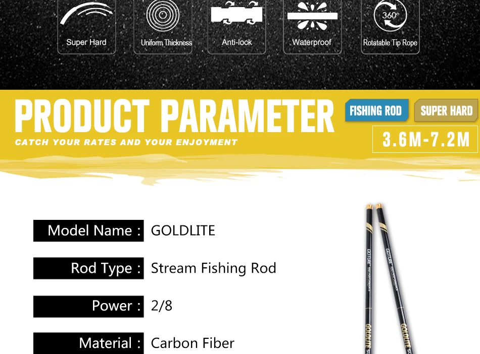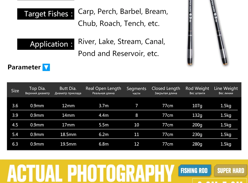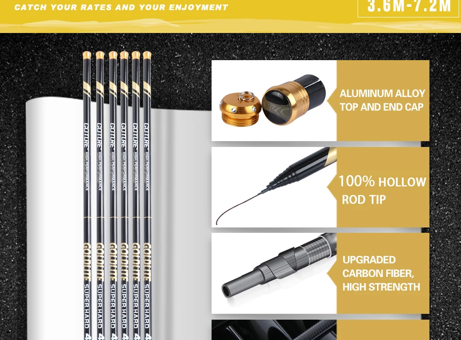 ¡El envío fue muy rápido! Podría usar más protección, pero afortunadamente el producto llegó sano y salvo. Ambas cañas tienen una relación calidad-precio excepcional y funcionan bien. Traje carpas, bagres y cabezas de serpiente en los modelos de 4,5 m, 5,4 m, 6,3 m y 7,2: ¡me encantan todos!