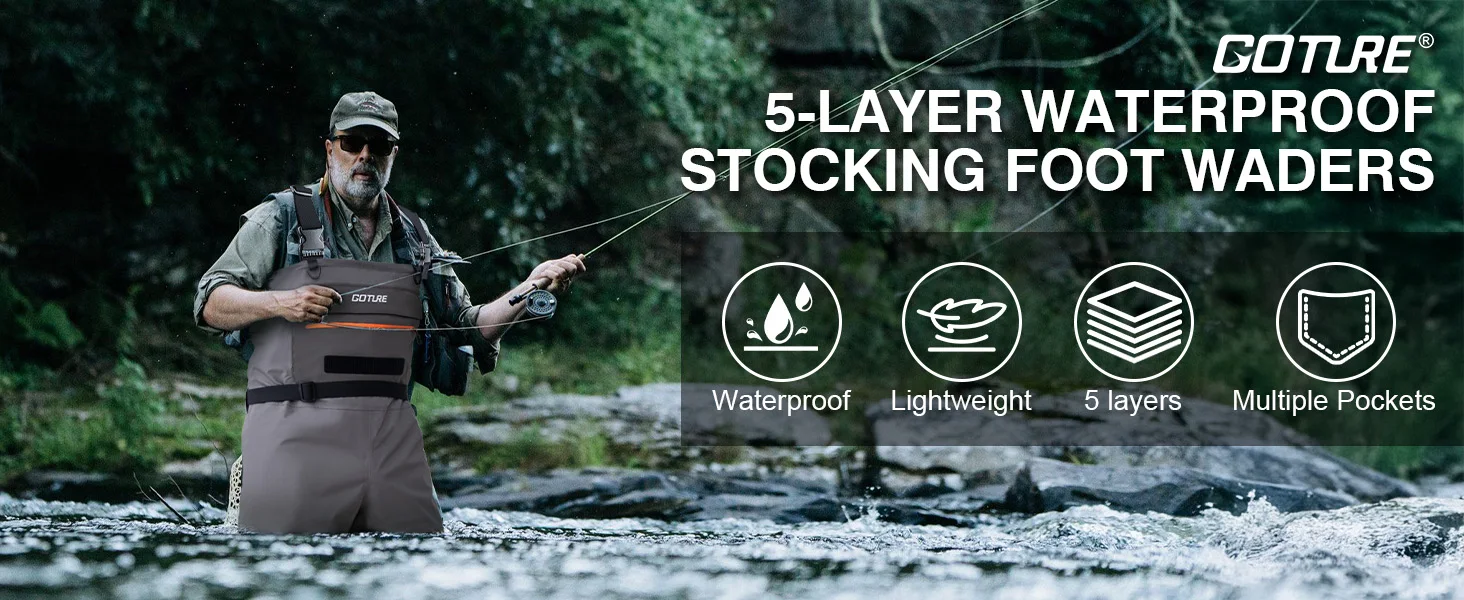 Goture Juego de botas de pescador con medias impermeables de 5 capas, botas de pesca con mosca transpirables para hombres y mujeres, múltiples bolsillos de almacenamiento, 5 tamaños