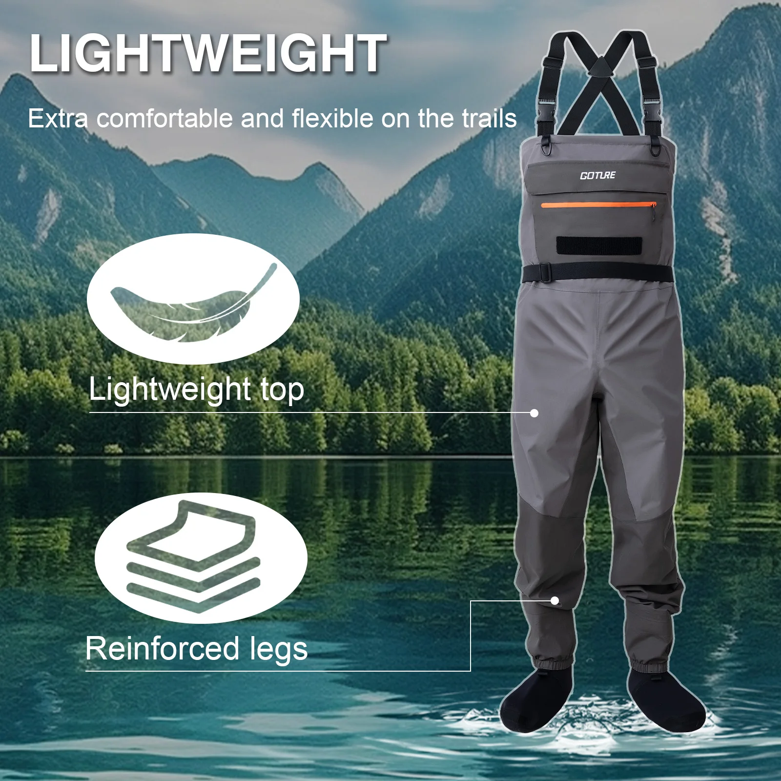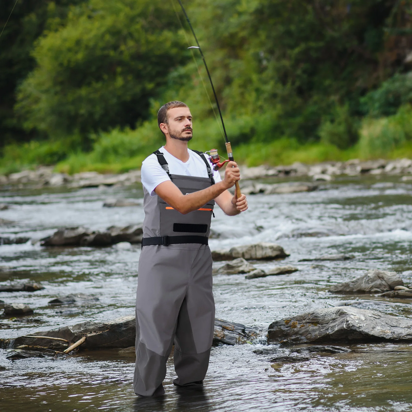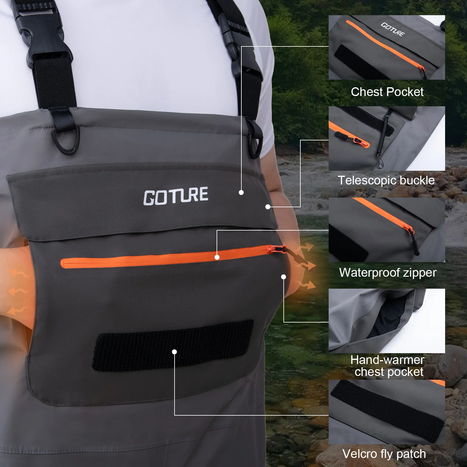 Cremallera frontal impermeable en el pecho: Equipadas con una cremallera impermeable de alto sellado en el pecho, estas orejeras de pesca con mosca facilitan ponerse y quitarse mientras evitan que el agua fuera.La cremallera es ajustable para ventilación, lo que te ayuda a mantenerte fresco y cómodo durante todo el día.