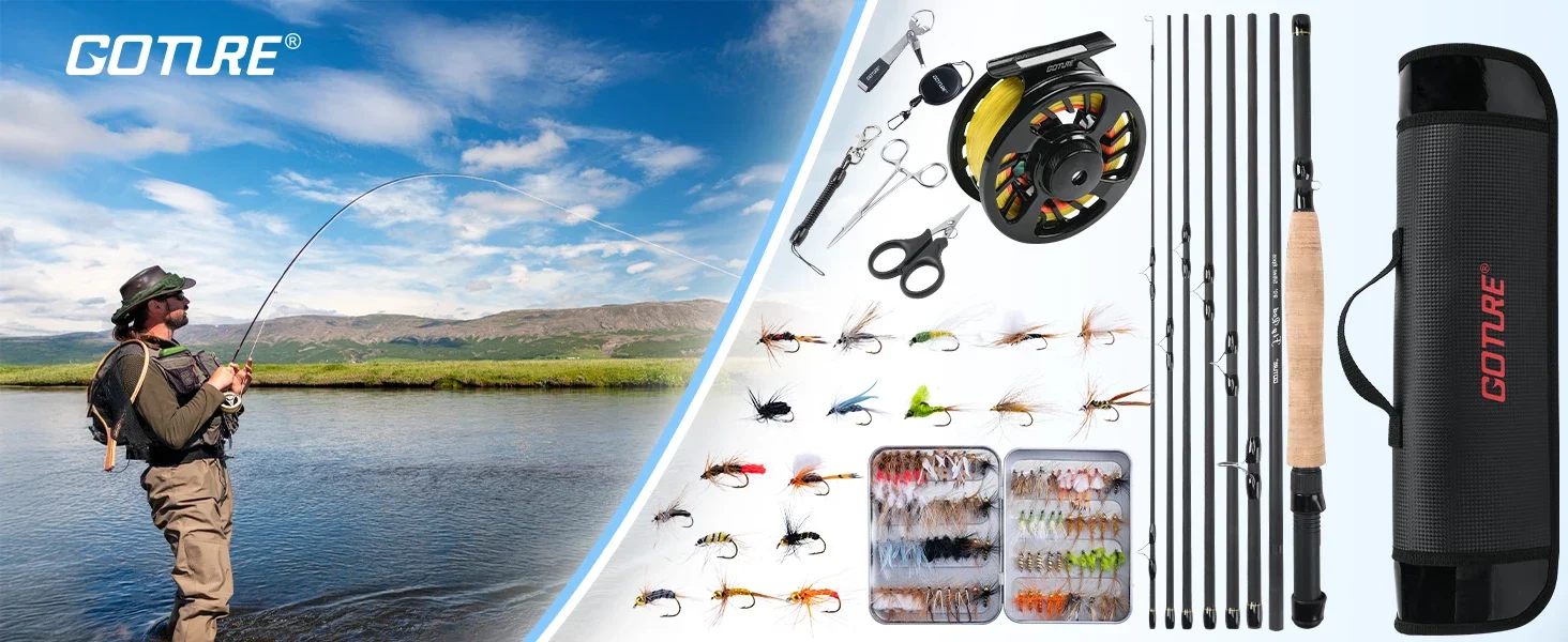 Juego de caña y carrete de pesca con mosca Goture de 2,7 M con accesorios de herramientas, arroyos combinados completos y aparejos de lagos con bolso