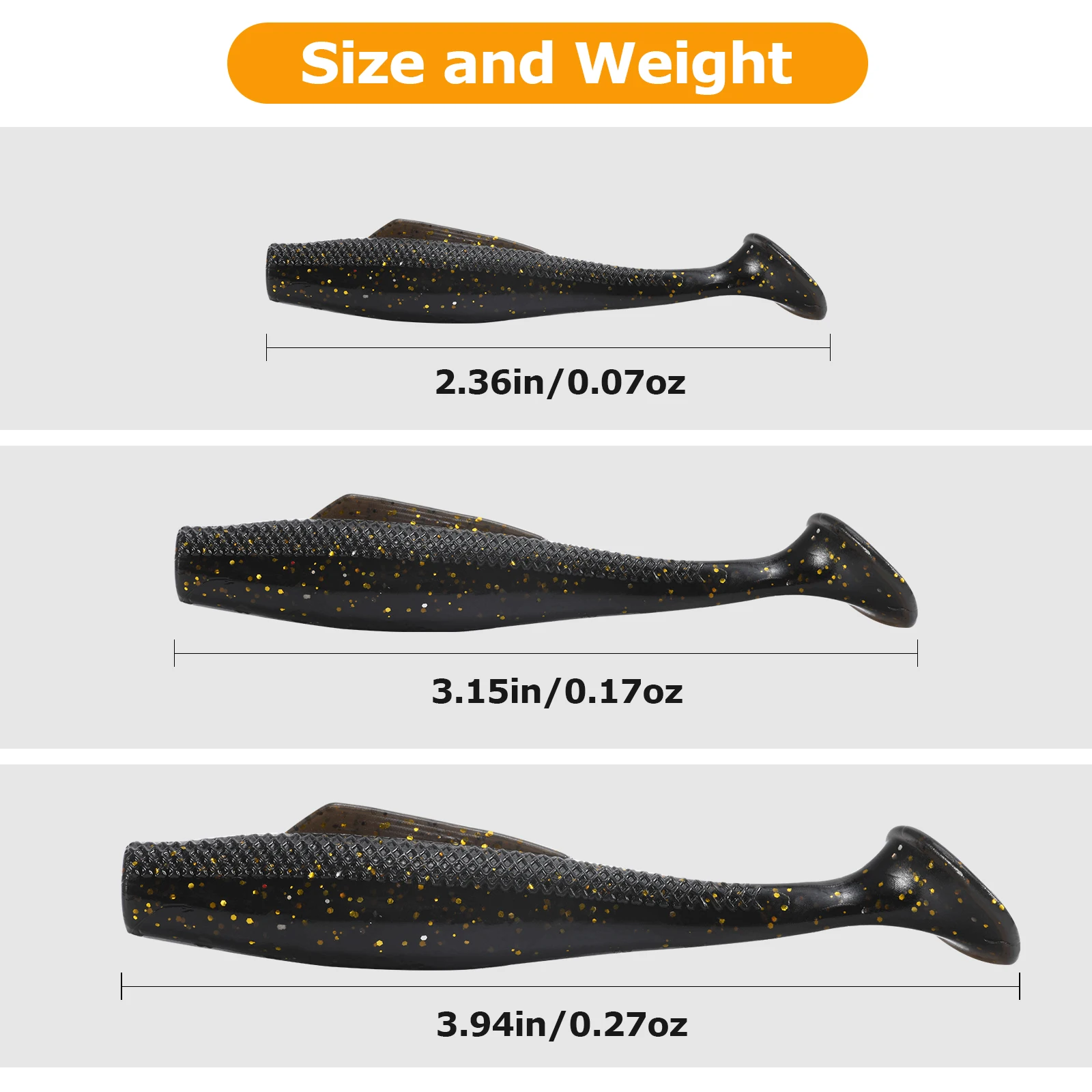 【Material TPR】Como los cebos de natación de cola de paleta blanda están hechos de material TPR, trate de no ponerlo en una bolsa con sus otros señuelos blandos para evitar reacciones químicas que puedan dañar su señuelo.