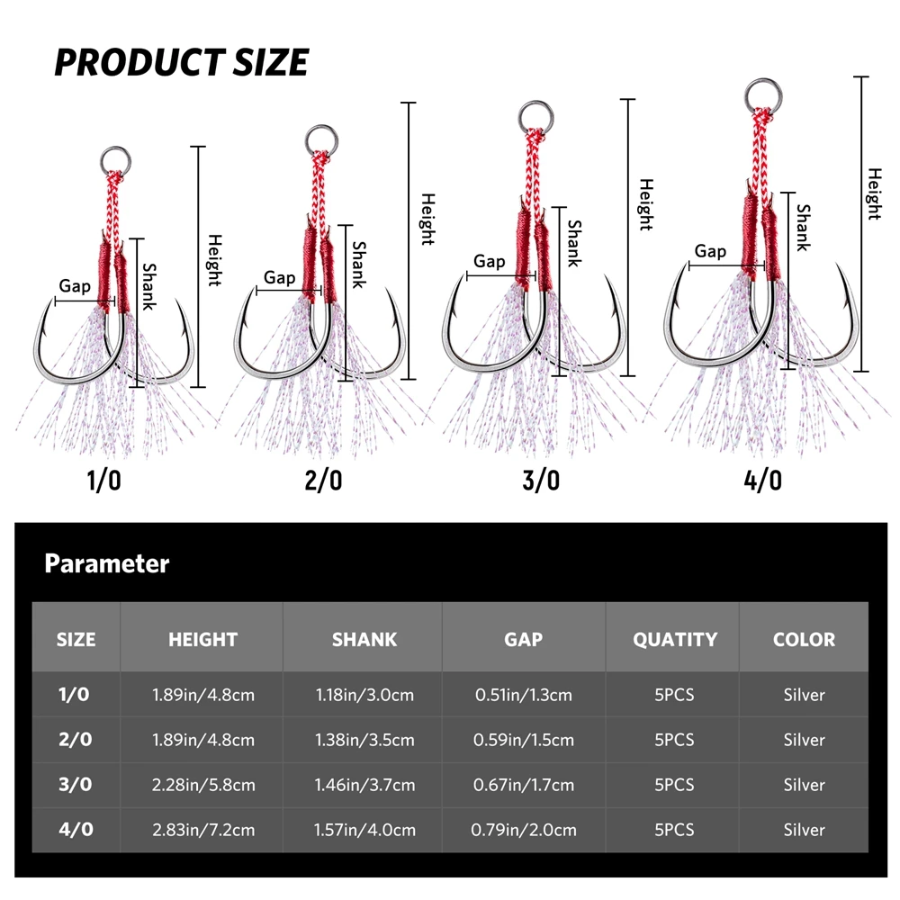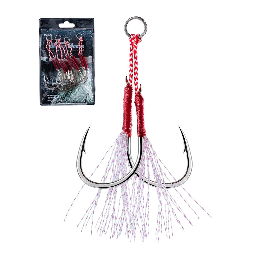 Las coloridas plumas de cristal añadidas al final hacen que estos anzuelos de doble asistencia jigging sean vívidos y más atractivos.Al mismo tiempo, estas coloridas plumas de cristal pueden mostrar una acción de natación realista en el agua y atraer mejor a los peces objetivo para morder el anzuelo.