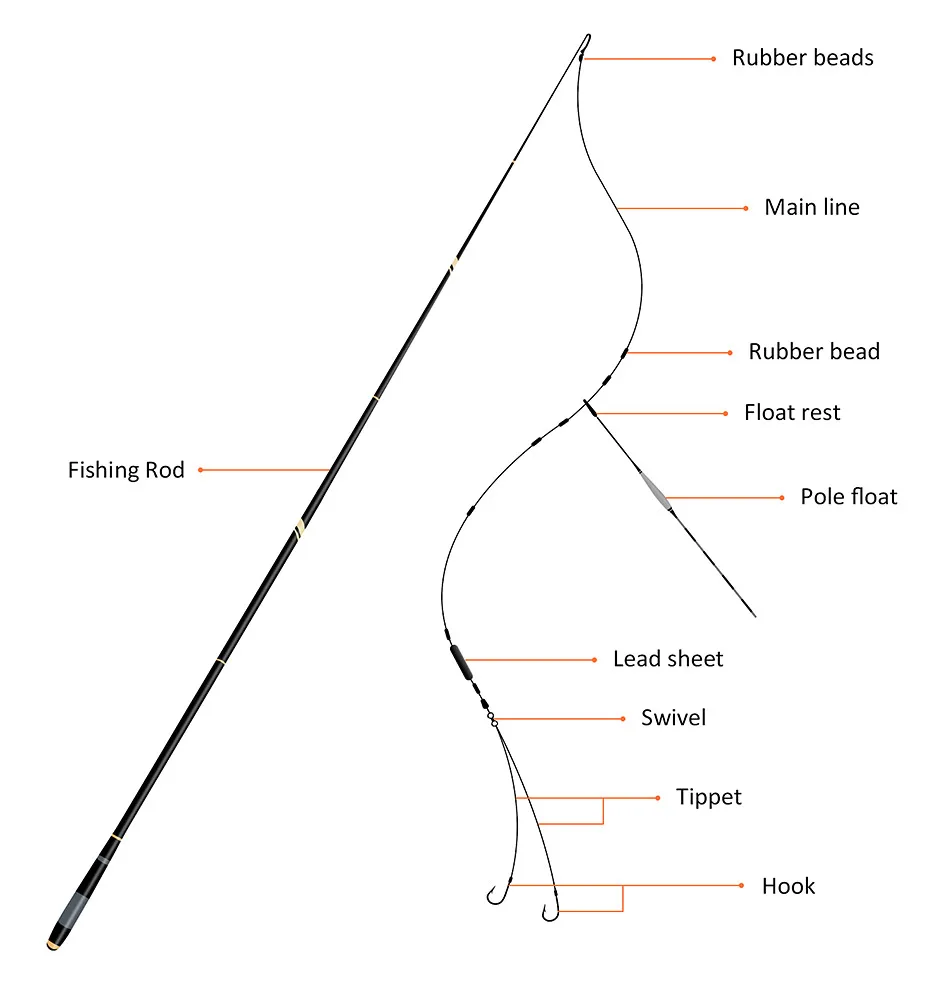 1 caña de pescar.+ Tres puntas superiores + Flotador de pesca + aparejo de pesca