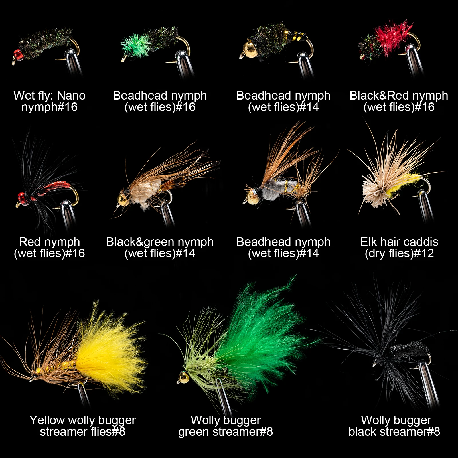 Goture-Kit de moscas de pesca con mosca, serpentinas de moscas de Nymph húmedas y secas, equipo de pesca con mosca, accesorios de anzuelo de trucha, regalo, 100 unids/lote por caja