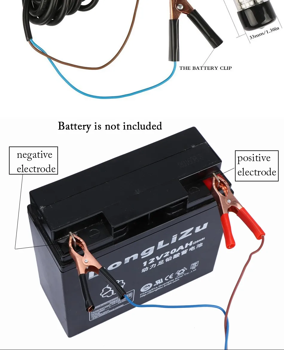 Debe ser inferior a 40 grados centígrados/104Fahrenheit Connecttoany12VDCbattery; Clipinduded The package induded:1 * fish light