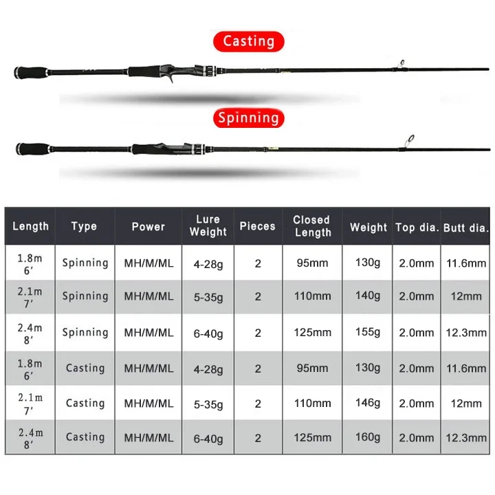 Goture ML + M + MH tres puntas portátil 2 secciones fibra de carbono Spinning Casting pesca caña de viaje 1,8 m 2,1 m 2,4 m cañas de lubina