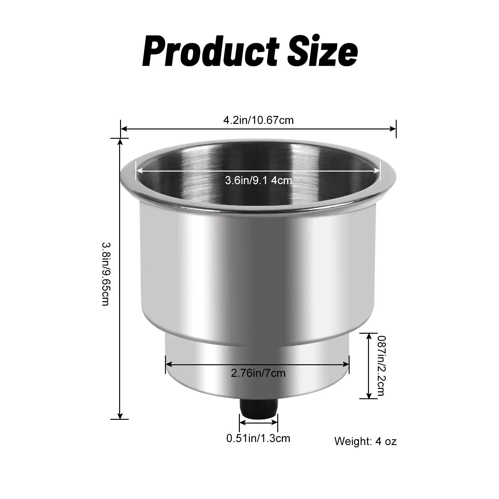 El portavasos Goture de acero con desagüe tiene una altura de 4 pulgadas y un diámetro interior superior.de 3,5 pulgadas, diámetro exterior superior.de 4,25 pulgadas y diámetro inferior.de 2,8 pulgadas con un agujero recortado de 3,75 pulgadas necesario.