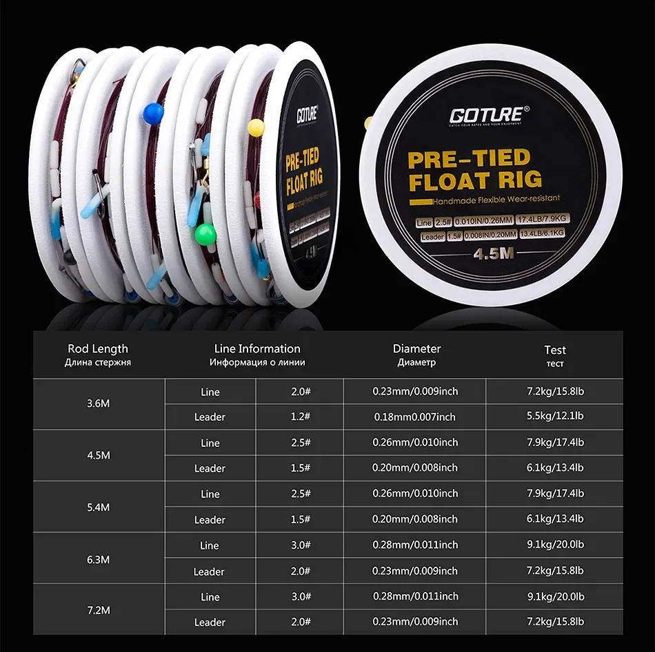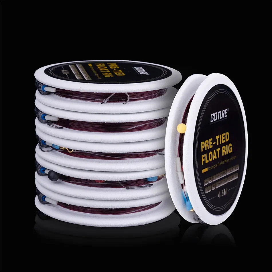 El Convenient Line Rig de GOTURE está atado a mano con artesanía experta. Se puede atar directamente al poste,Ahorrando mucho tiempo. El aparejo de pesca consiste en línea principal, flotador, resto de flotador, cuentas, hoja de plomo, asiento de hoja de plomo,Giratorio y Tippet equipado con ganchos.