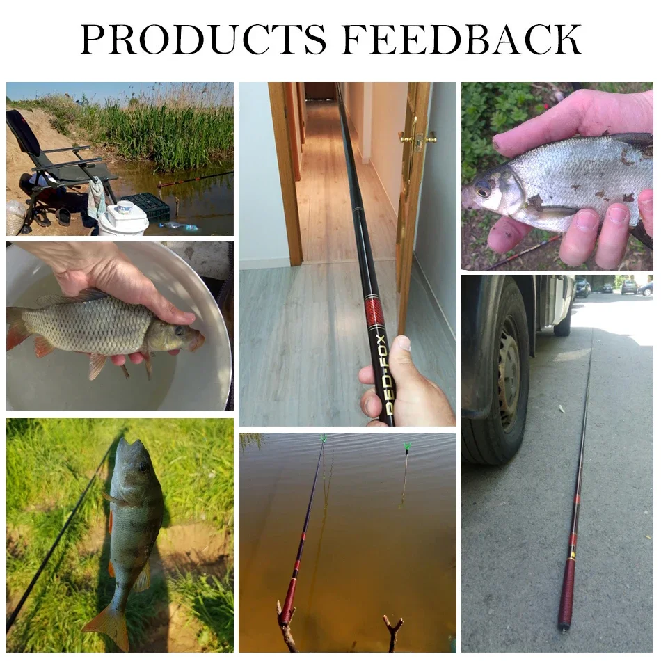 Caña de pescarCaña de pescar manual de corriente telescópica RED-FOXPotencia: 3/7Acción: rápidoMaterial: fibra de carbonoTamaño: 3,0 M/3,6 M/4,5 M/5,4 M/6,3 M/7,2 MPeso de prueba: 1,5-2,0 kgLongitud cerrada: 72cmFlotador de pescaMaterial: PMI FOAM. Longitud completa: 41,5 cm. Longitud del pie: 12cm. Longitud de la cola: 20,5 cm. Flotabilidad: 3,56G.Aparejo de pescaCuentas de ladrón de primera calidad: proporciona la máxima protección a los nudos y componentes de la plataformaResto del flotador ladrón: sostiene el flotador firmemente, excelente hermeticidad al aireHojas de plomo: adoptando tecnología de biselado, menos resistencia al agua, más rápido en su lugar, prevención efectivaGrietas de plomoCarrete/carrete EVA: suave, delicado y duradero, no abrasivo para las líneas.El paquete incluyeCaña de pescar + flotador de pesca + aparejo de pesca + tres puntas superioresEspecies objetivo: carpa, perca, barbo, besugo, Cacho, cucaracha, Tenca, trucha, etc.Aplicación: Río, lago, Arroyo, canal, estanque y depósito, etc.