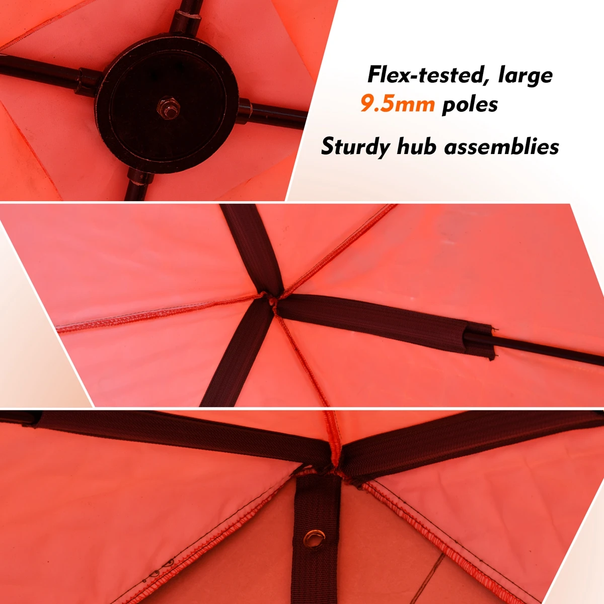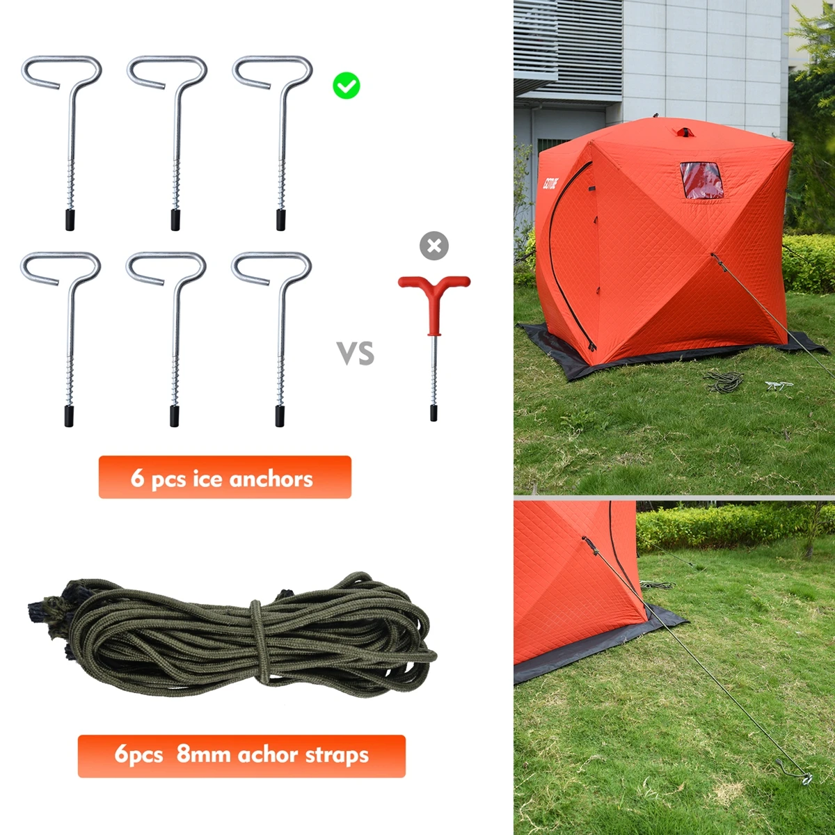 Las carpas de hielo adoptan postes grandes de 9,5mm probados en flexión y conjuntos de cubo resistentes para proporcionar una estabilidad superior para el refugio de hielo. Nuestro refugio de pesca en hielo para pescadores está equipado con 6 anclas de hielo autorroscantes totalmente metálicas de 3. Son más fáciles de agarrar y no se doblan debido a la presión. También se combina con 6 cuerdas de viento de 8mm de grosor para mantener estable el refugio de pesca en hielo aislado incluso en condiciones de viento.