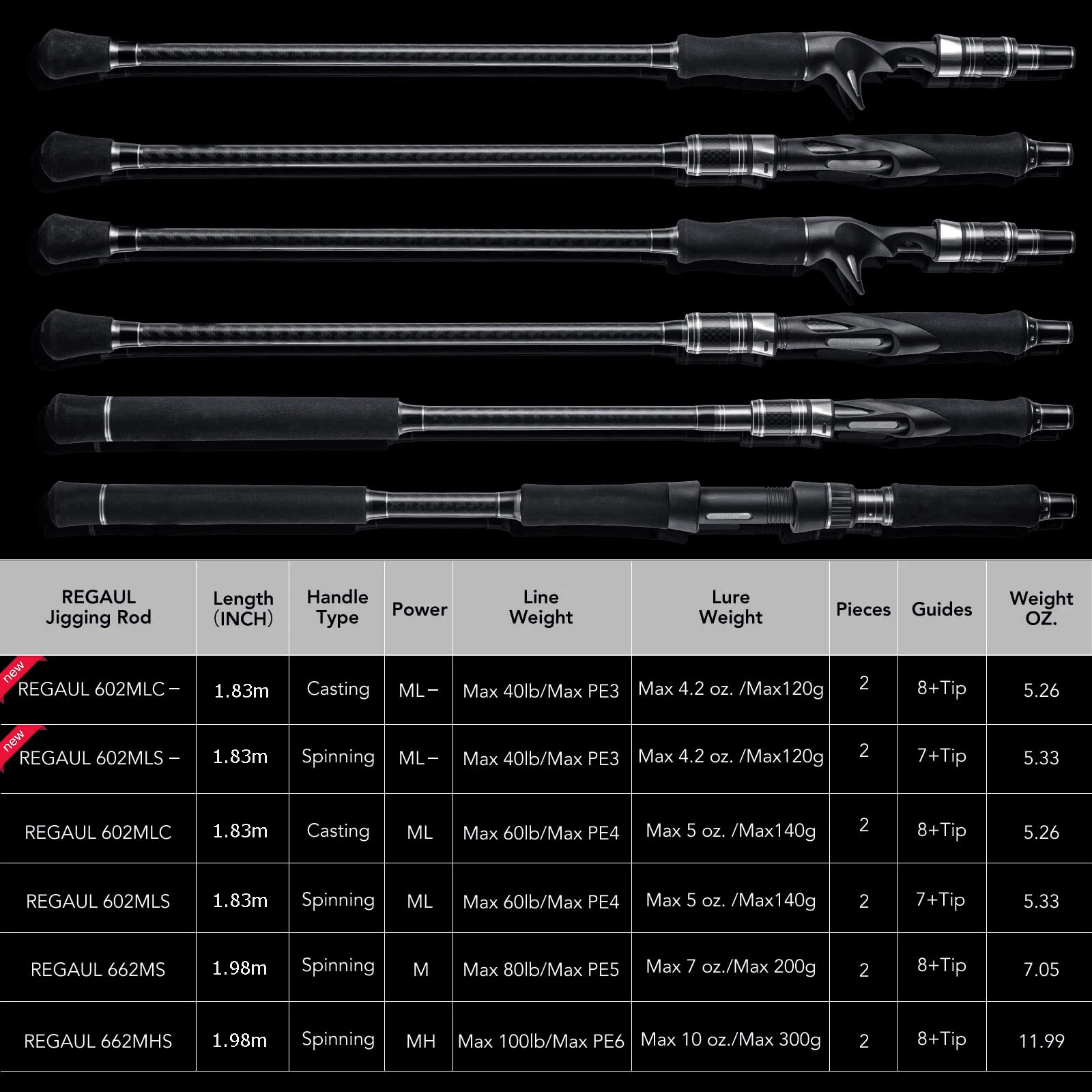 4. 【Múltiples peces objetivos】Combina especialmente con jigging vertical. Salmón, trucha, lubina, lubina rayada, mero, pargo de cordero, pez rey, atún aleta negra, etc. funcionan bien. El peso de la caña grande te ayuda a luchar contra los grandes. Peso de pesca: REGAUL 602MLC y 602MLS: aproximadamente 17.6lb/ REGAUL 662MS: aproximadamente 33lb/ REGAUL662MHS: aproximadamente 44lb