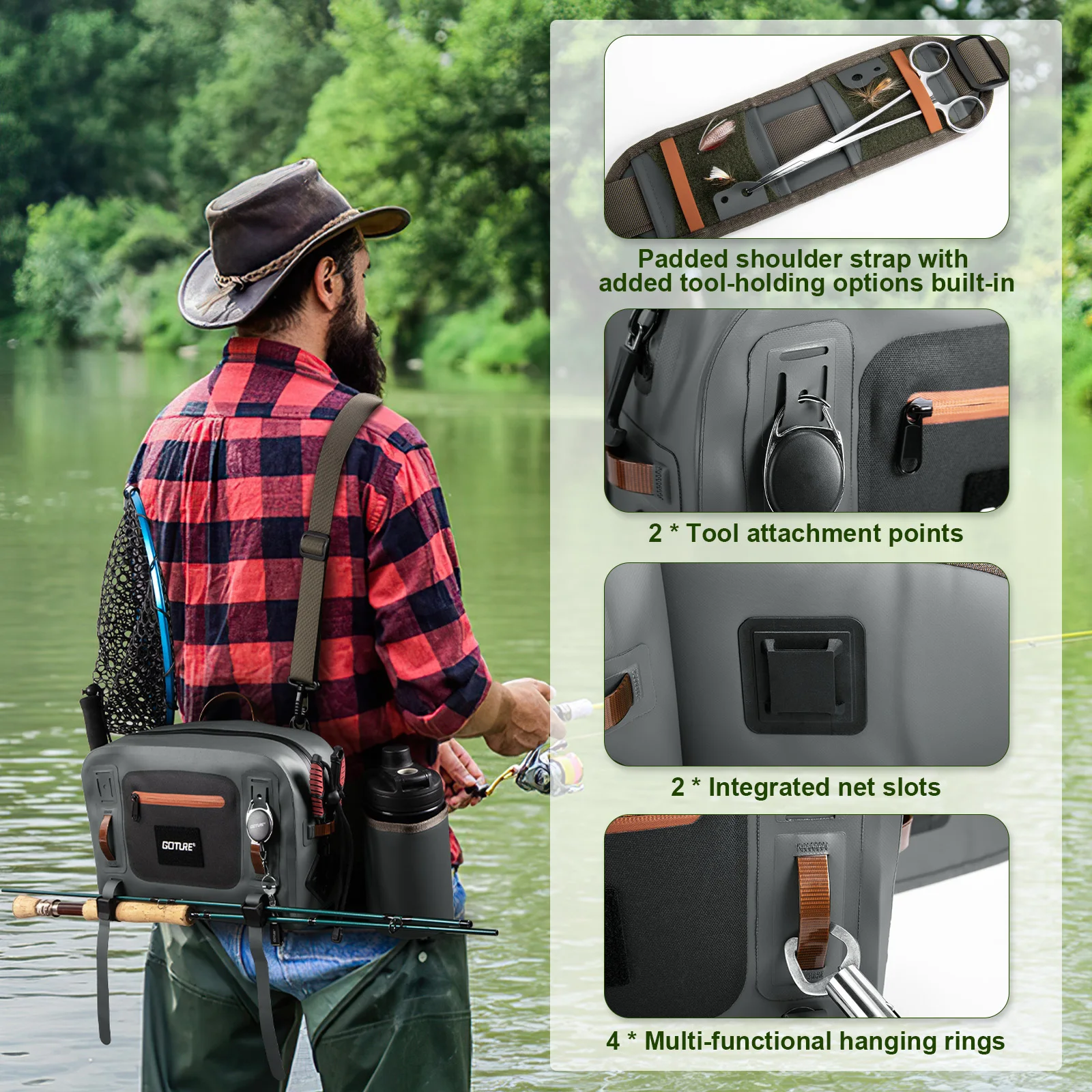 Goture-Bolso de cintura impermeable para pesca con mosca de 10L, 34,5x23x12,5 cm, ultraligero, con múltiples bolsillos, bolsa de pecho para pesca con almacenamiento para caña