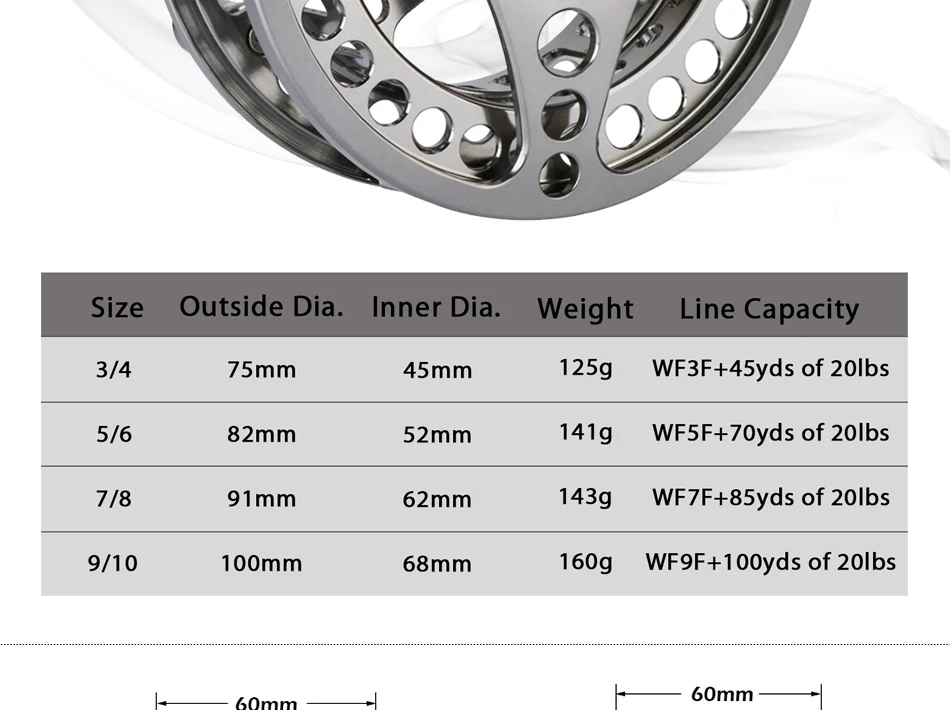 Tamaño 5/6 ---- Diámetro de salida: 85mm ----- Diámetro interior: 52mm Peso ----: 142g ---- Capacidad de la línea (m/mm):WF5F + 70yds de 20lbs