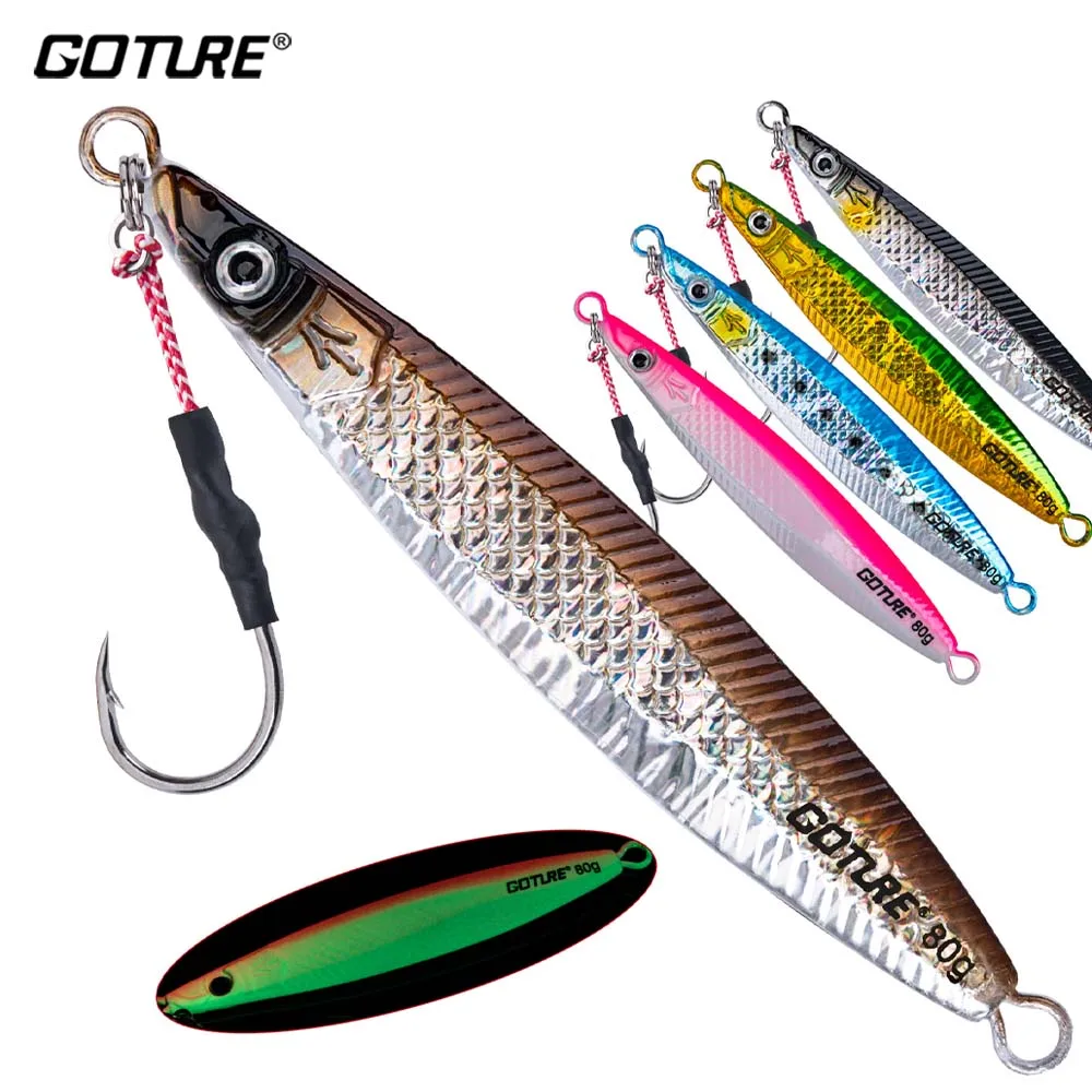 Goture 5 unids/lote Jigging cuchara señuelo de pesca 80g 150g 200g con ojos 3D y anzuelos luminoso mar profundo cebo Artificial duro