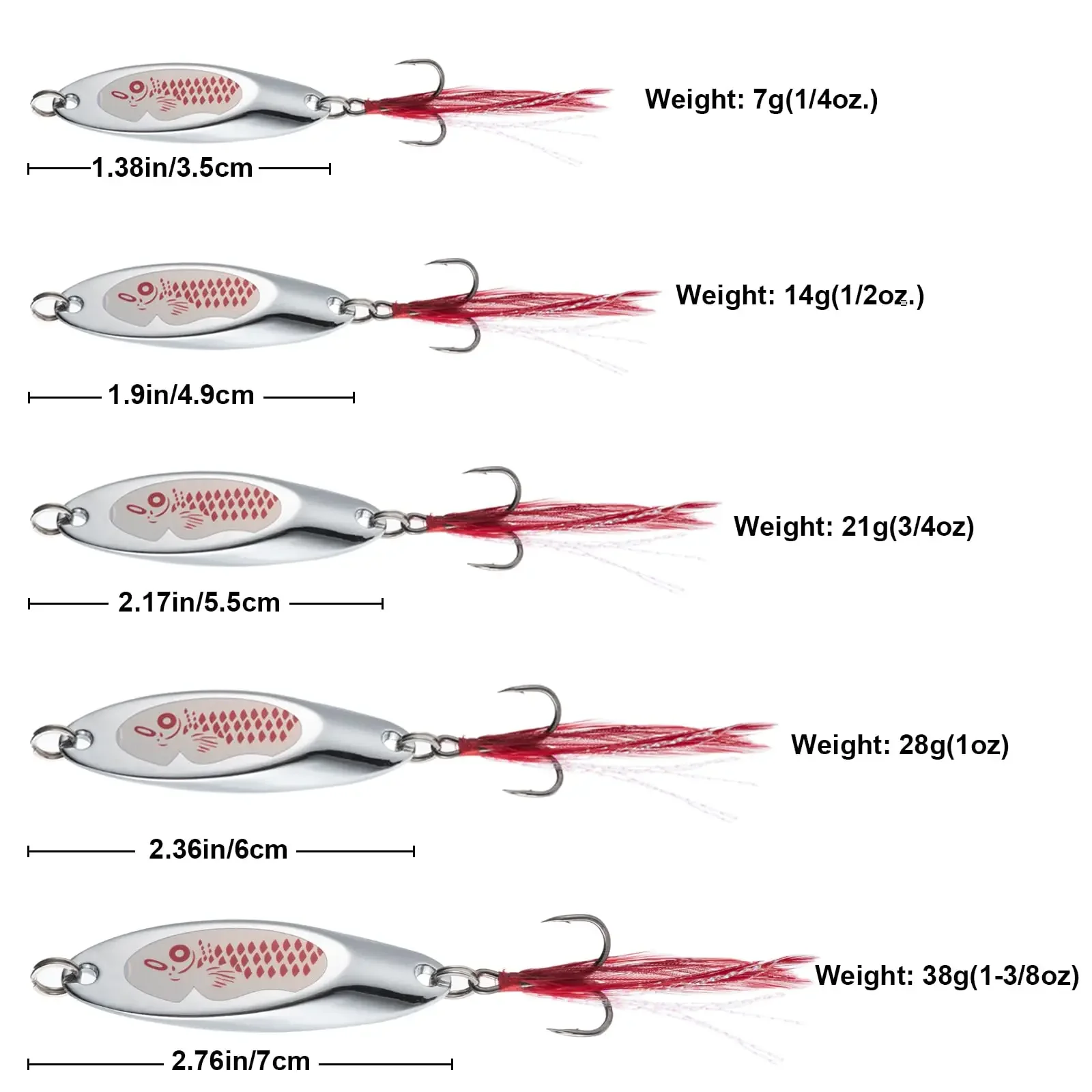 5. 【Elección múltiple】Un total de 10 cucharas de señuelo con el mismo peso en el paquete. 5 tamaños a elegir: 7g(1/4oz.), 14g(1/2oz.), 21g(3/4oz), 28G (1oz), 38g(1-3/8oz). Un Kit de Señuelos de Pesca imprescindible para todos los pescadores. Ya sea en invierno, otoño, verano o primavera. También es una gran opción de regalo para su padre, amigos, hermanos y entusiastas de la pesca.