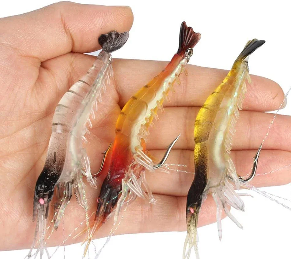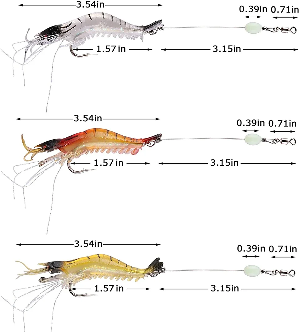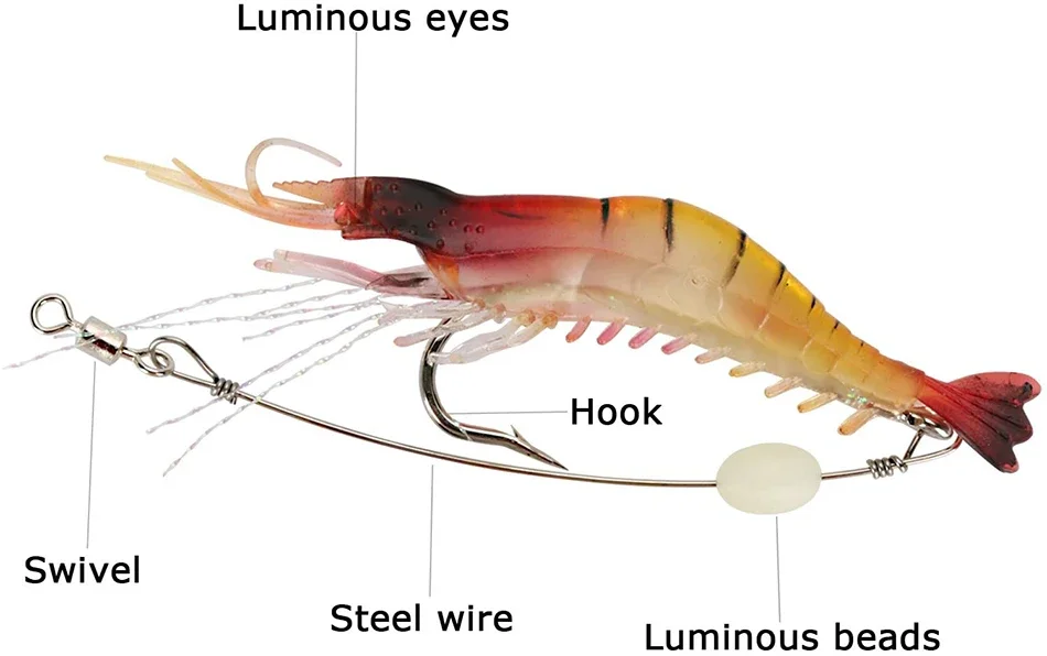 4. Especies Objetivo: El camarón de señuelo suave se puede utilizar para atrapar una variedad de peces como besugo, lubina, cabeza plana, merienda, platija, pez judío, pez rey, Cola de pelo, Perca Dorada, trucha, Redfisn, bonito, salmón, Sastre, bonito, atún pequeño, cola amarilla, caballa, calamar y cualquier especie de agua dulce y salada