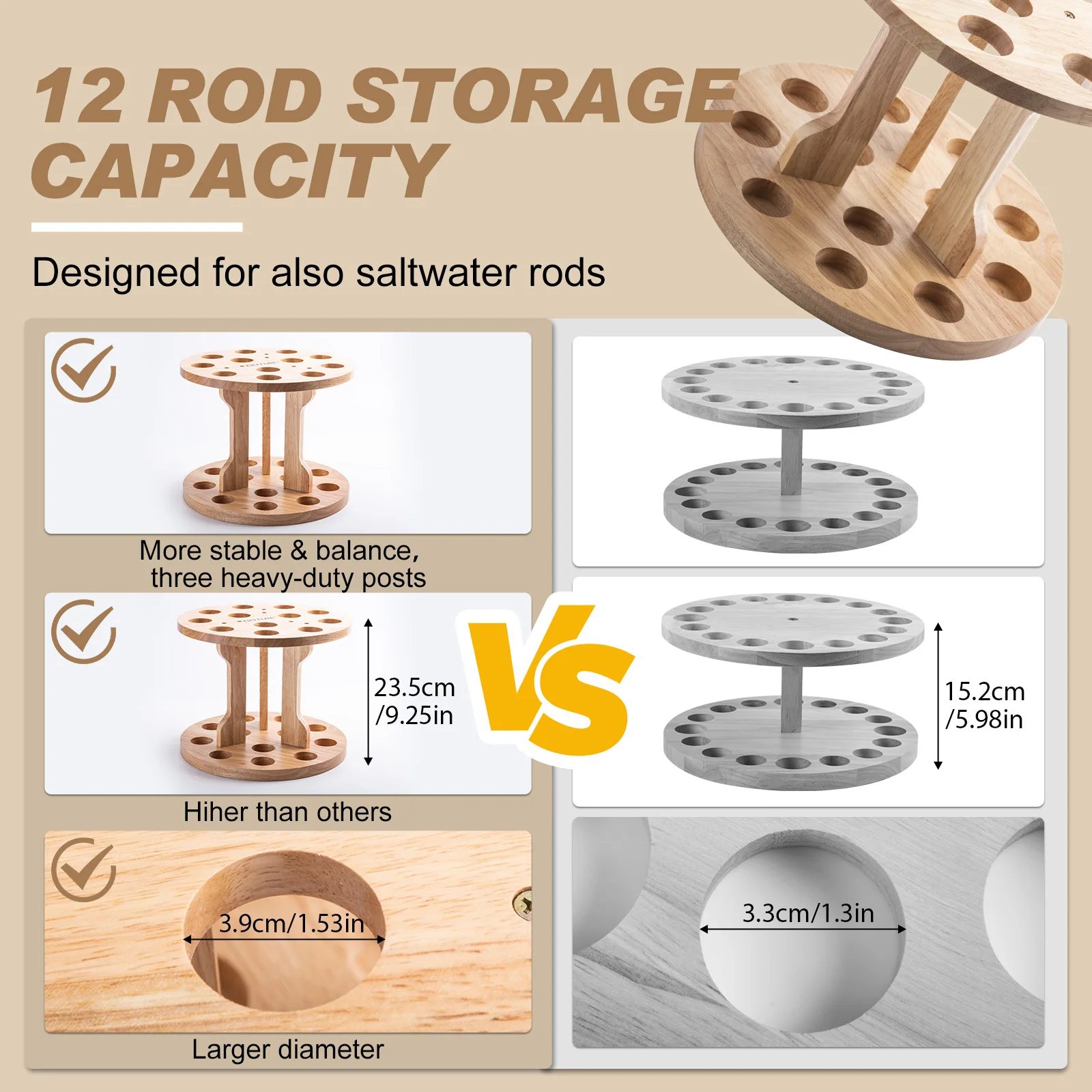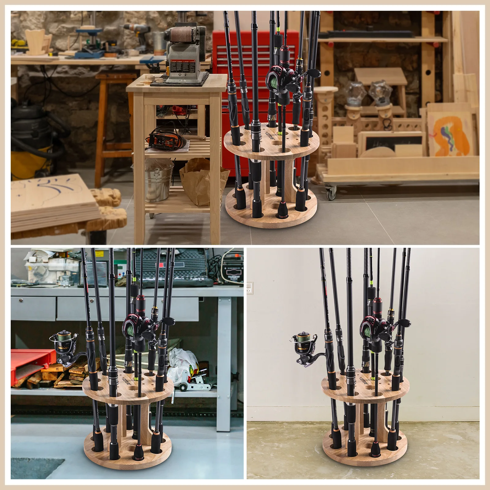 Características: 1.Material: madera de caucho, hierro galvanizado 2.La altura del soporte para cañas de pescar aumenta y puede contener varias cañas, como cañas de mar, cañas de señuelos y redes de pala. 3.El espacio entre agujeros es grande y las cañas de pescar se pueden insertar y quitar fácilmente. 4.La madera de caucho tiene una textura hermosa, alta dureza y resistencia al desgaste, y el material de madera maciza tiene una vida útil más larga. 5. El producto es sencillo y cómodo de montar.
