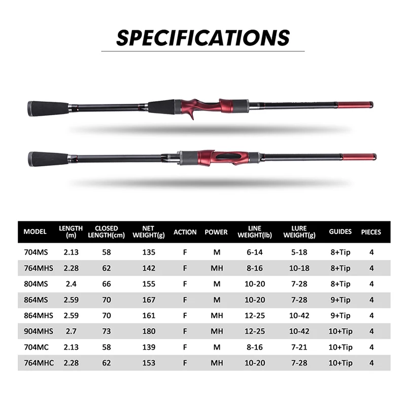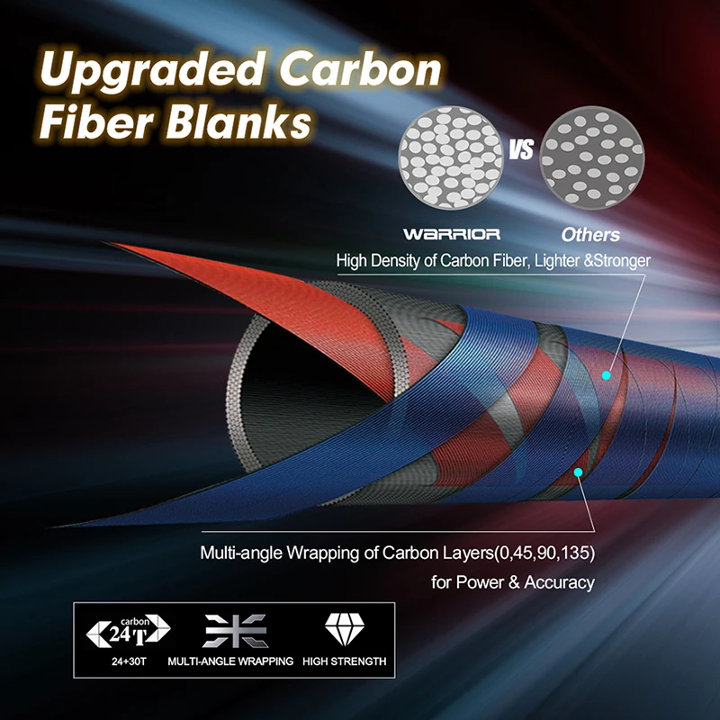 1. La fibra de carbono de 24 + 30T y el envoltorio multiangular de capas de carbono, hizo la caña más liviana y más fuerte;.