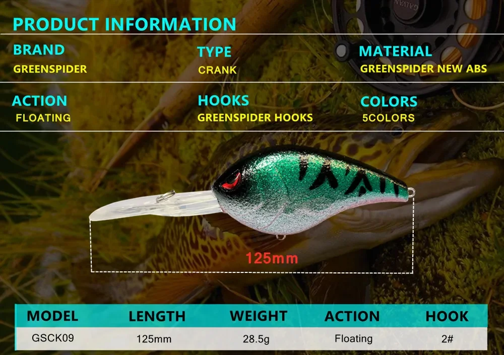 GREENSPIDER-señuelo de pesca flotante Crankbait, 125mm, 28,5g, cebos de manivela, señuelos duros para Lucio, Pesca de agua dulce