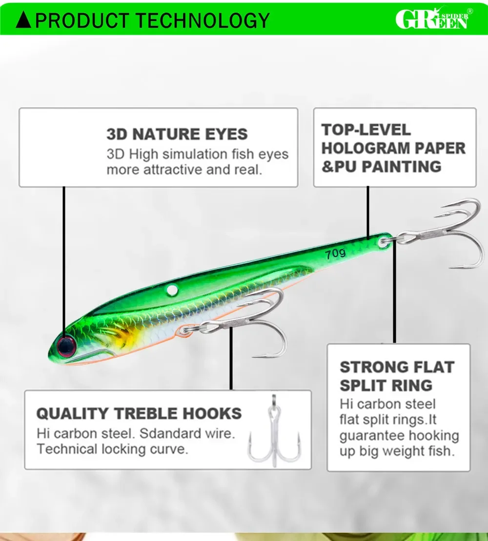 GREENSPIDER-señuelos VIB para Pesca en el mar, 125mm, 70g, sonajero, vibración que se hunde, láser de alta calidad, Pesca, lubina, atún, aparejos de pesca azul