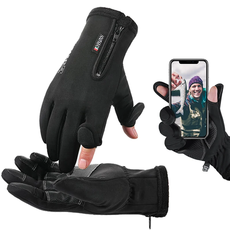 Guantes de pesca gruesos, manoplas cálidas antideslizantes, resistentes al agua, con dos dedos cortados, pantalla táctil, accesorios de pesca para invierno al aire libre, 1 par