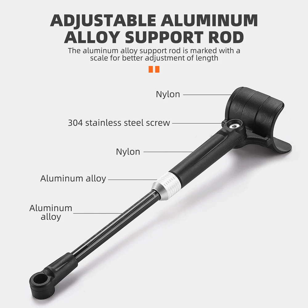 La varilla de soporte de aleación de aluminio está marcada con una escala para un ajuste fino de la longitud.