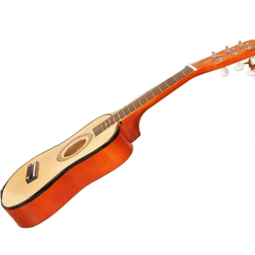 This item is a 21inch folk acoustic guitar, sized especially for young players. It is made of wood material, wear-resistant, not easy to crack and firm. Great tone, comfort, and playability. It is great for beginner who want to learn how to play guitar and good choice as a present for your friends or families.