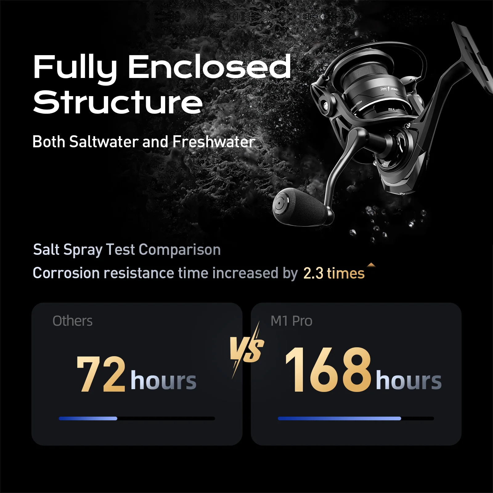 El carrete giratorio M1 PRO, basado en M1, se han realizado 2 mejoras principales, permite que sea adecuado tanto para agua salada como para agua dulce.