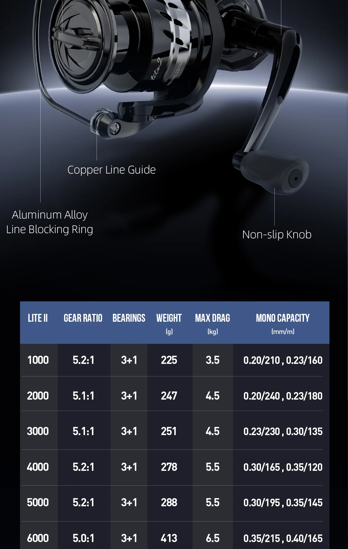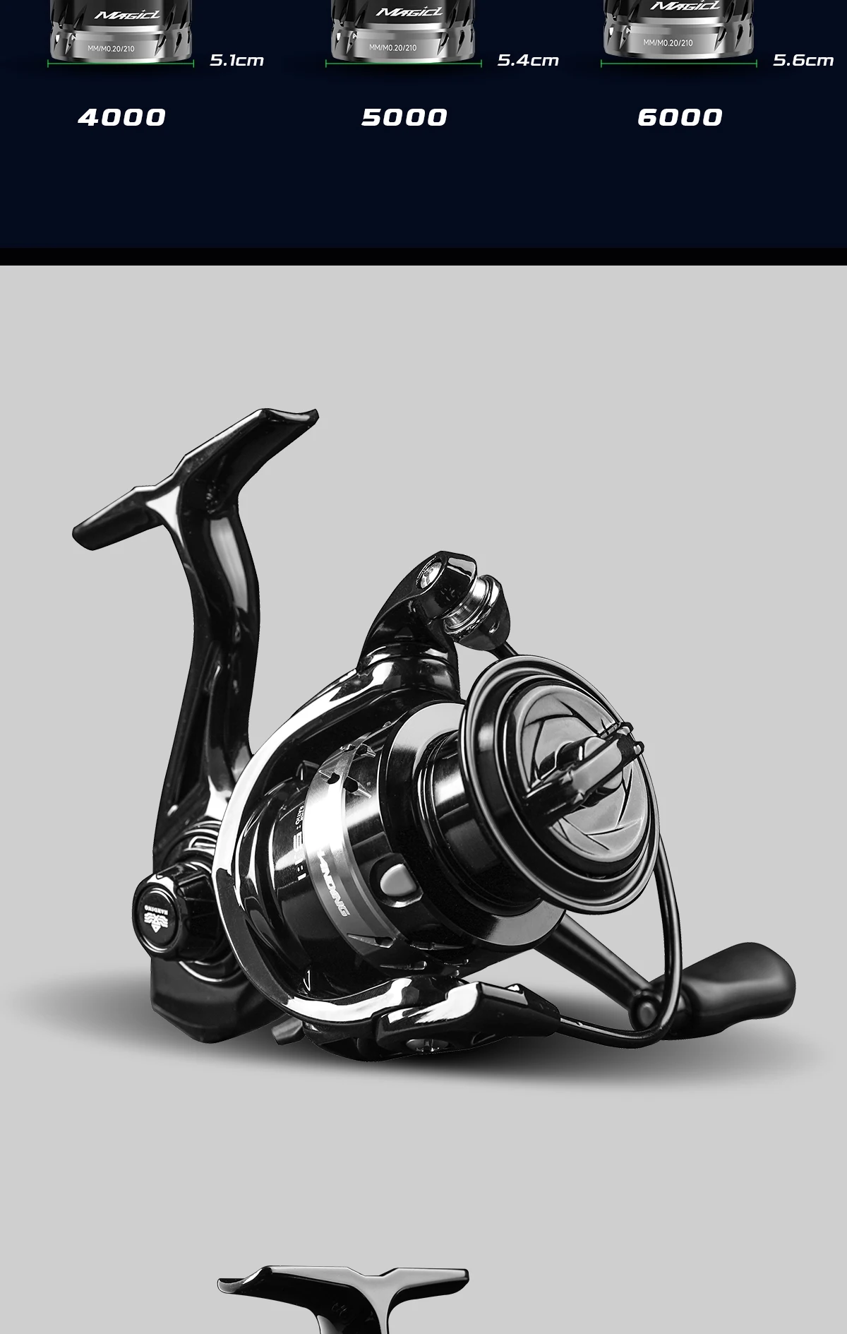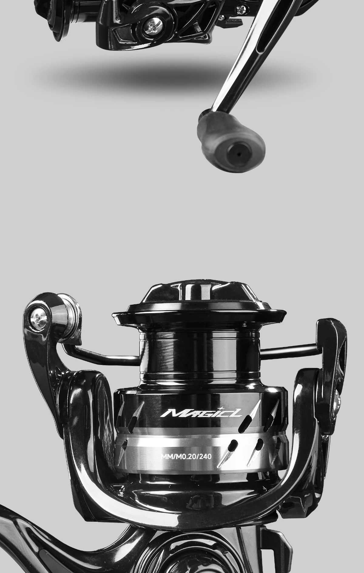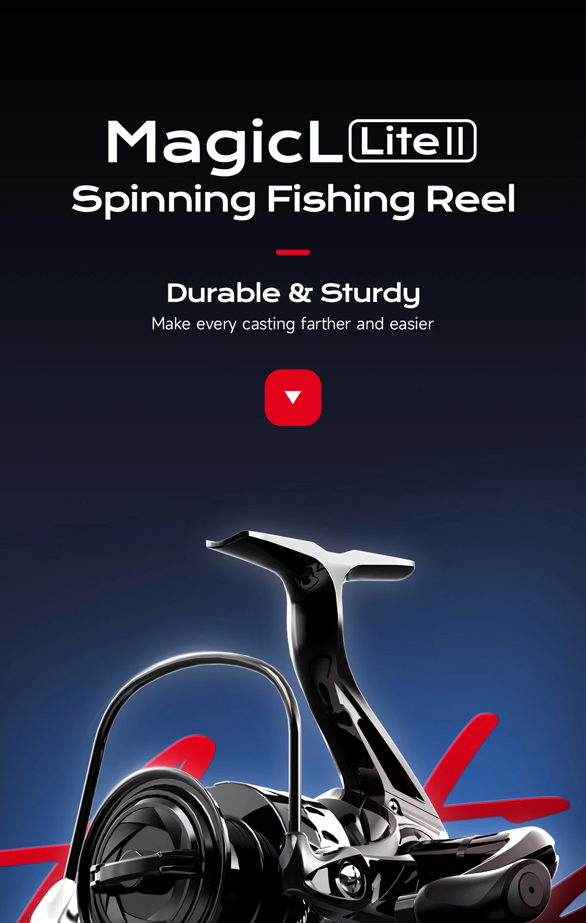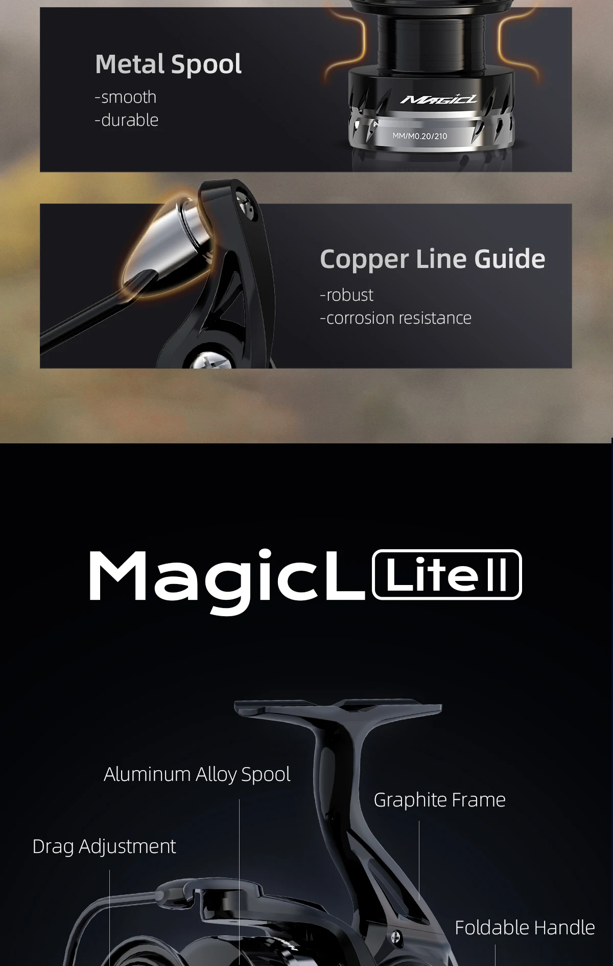 El carrete giratorio Magic L Lite II, diseñado para combinar peso ligero, resistencia y durabilidad.Es una filosofía de innovación asequible del carrete de pesca básico.