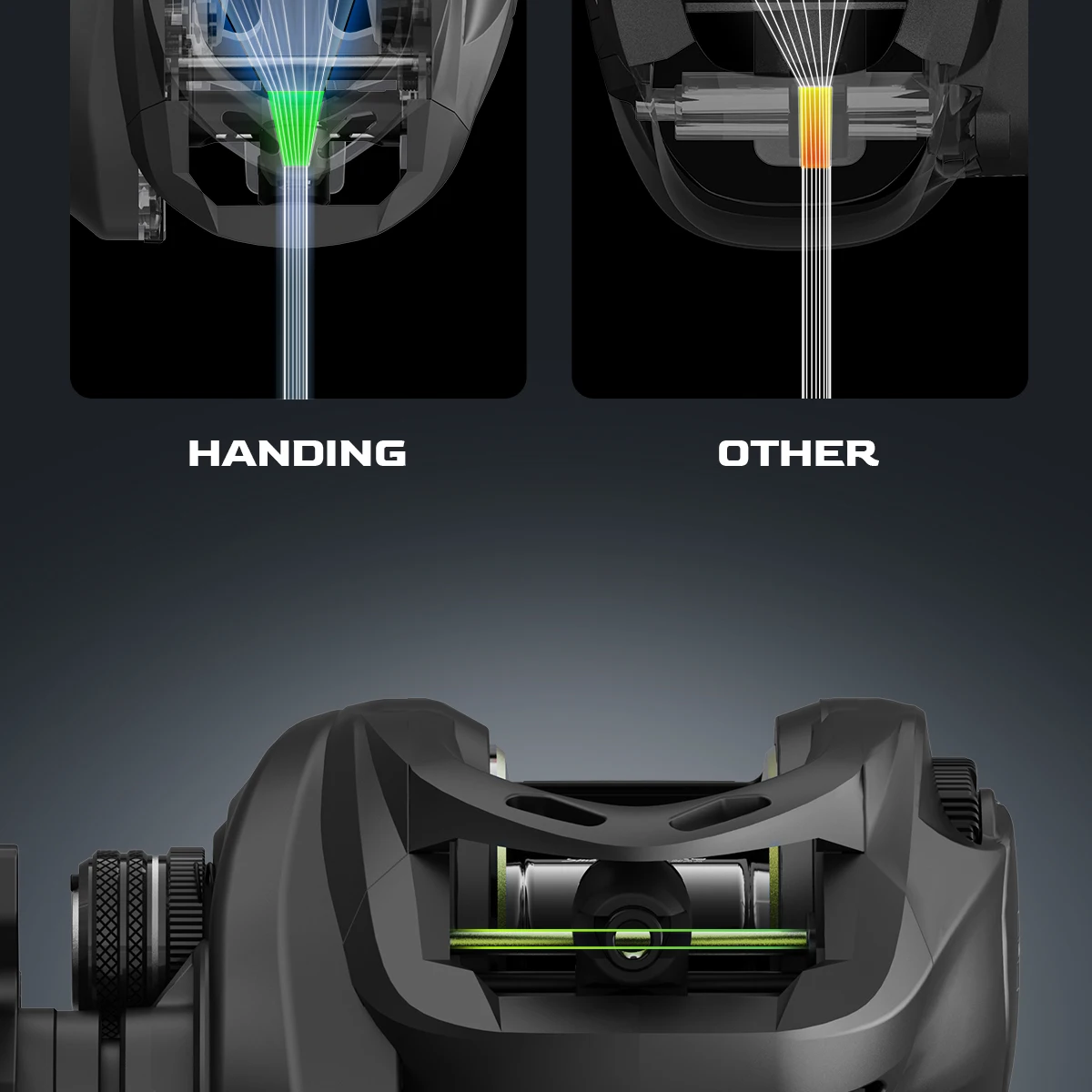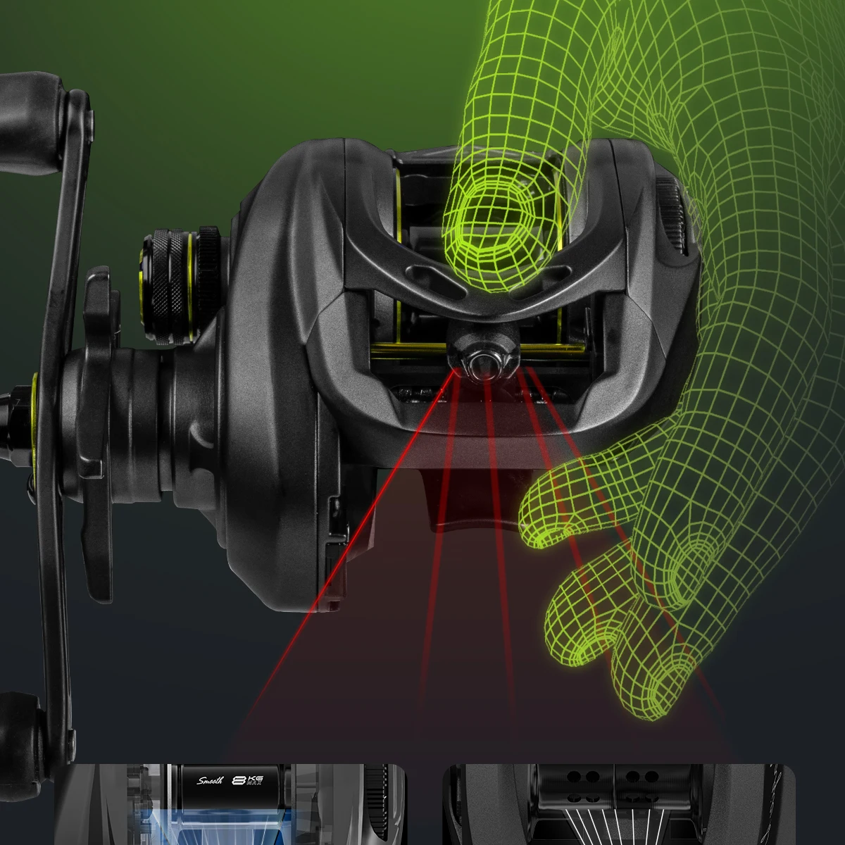 ● Las perillas de goma suave y el diseño de perfil bajo mejoran la comodidad de la experiencia de pesca.