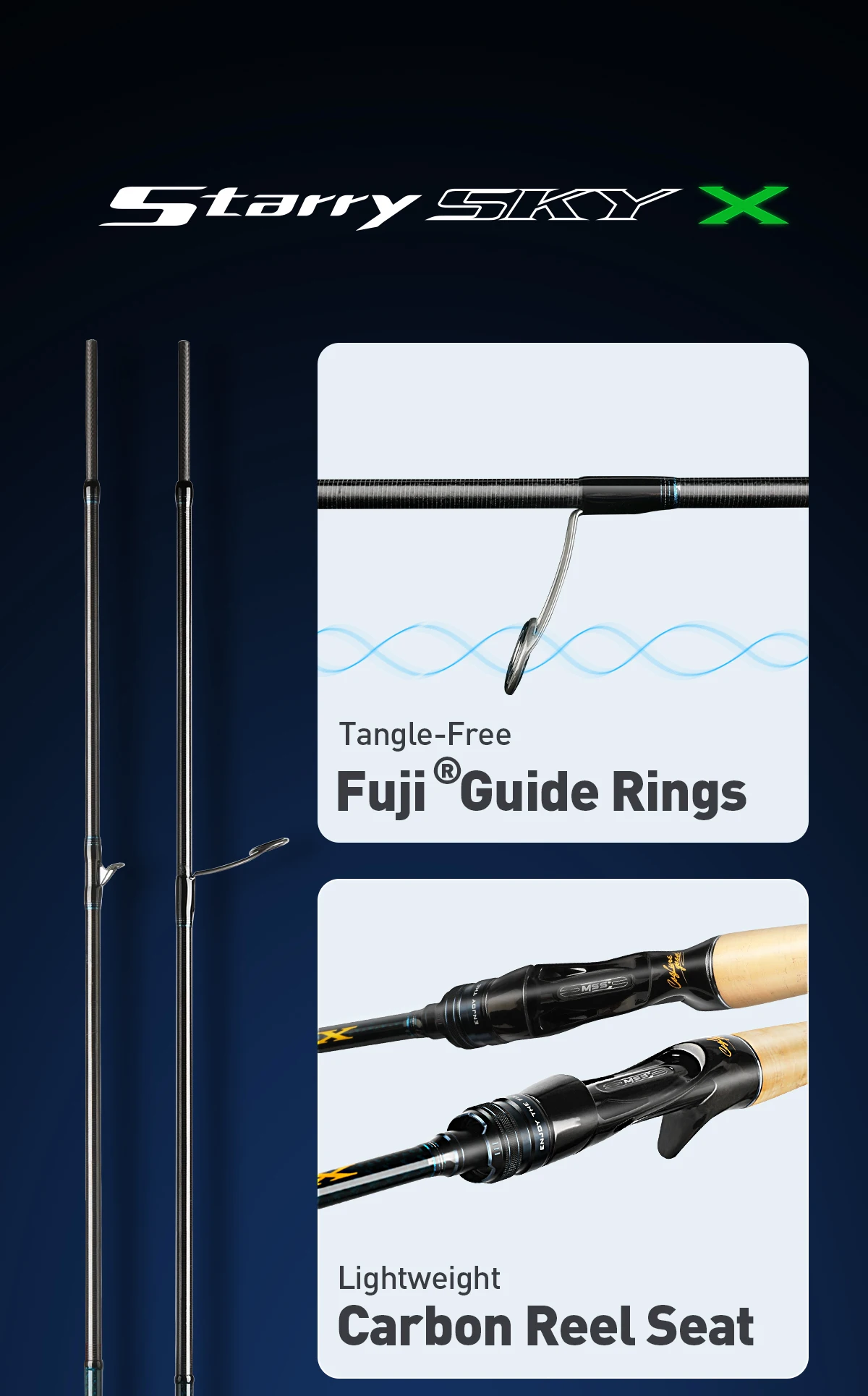 Con el fin de satisfacer las necesidades de los pescadores de cañas de pescar de gusanos profesionales, HANDING diseñó las cañas de pescar de la serie Starry Sky X, que incluyen dos tipos de cañas giratorias y cañas de fundición, con un total de 6 tipos de varillas. Sus diferentes combinaciones de longitud, potencia y acción cumplen con los requisitos de diferentes plataformas de cebo de gusano blando.