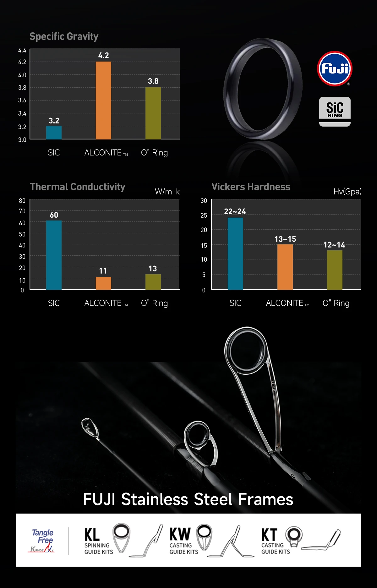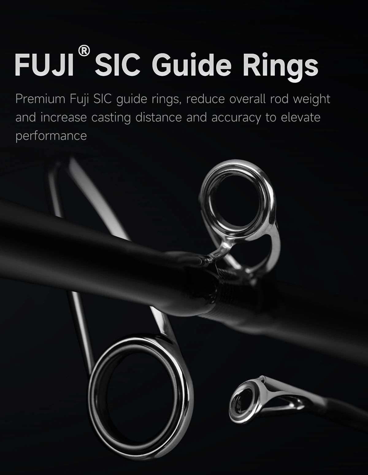 Anillos guía Fuji SIC premium reducen el peso total de la caña y aumentan la distancia y precisión de lanzamiento para mejorar el rendimiento.