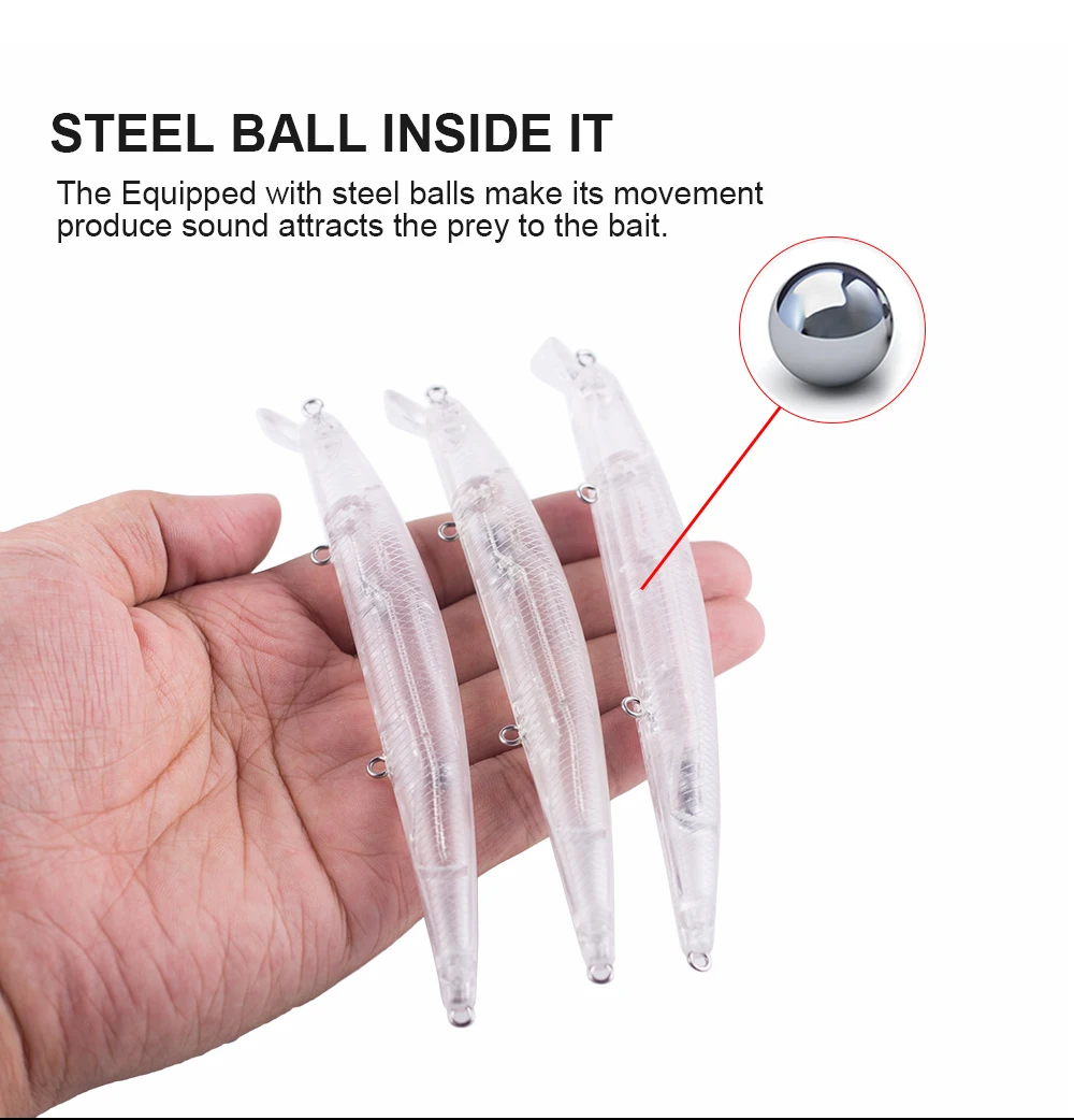 La acción de natación perfecta es mortalmente atractiva para los peces. Este Tipo de señuelo de pesca muestra una acción de natación animada en el agua, con bola de acero en el interior, Los cebos pueden mantenerse estables durante el lanzamiento y pueden aumentar la distancia de lanzamiento al mismo tiempo.