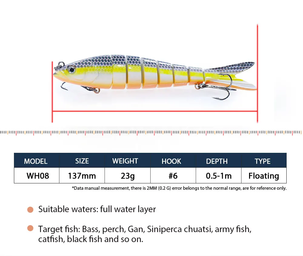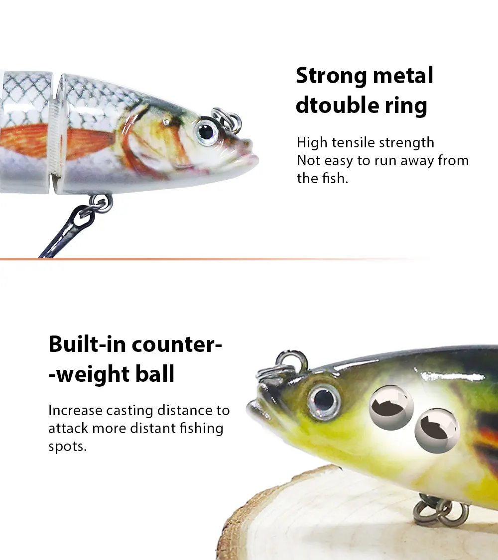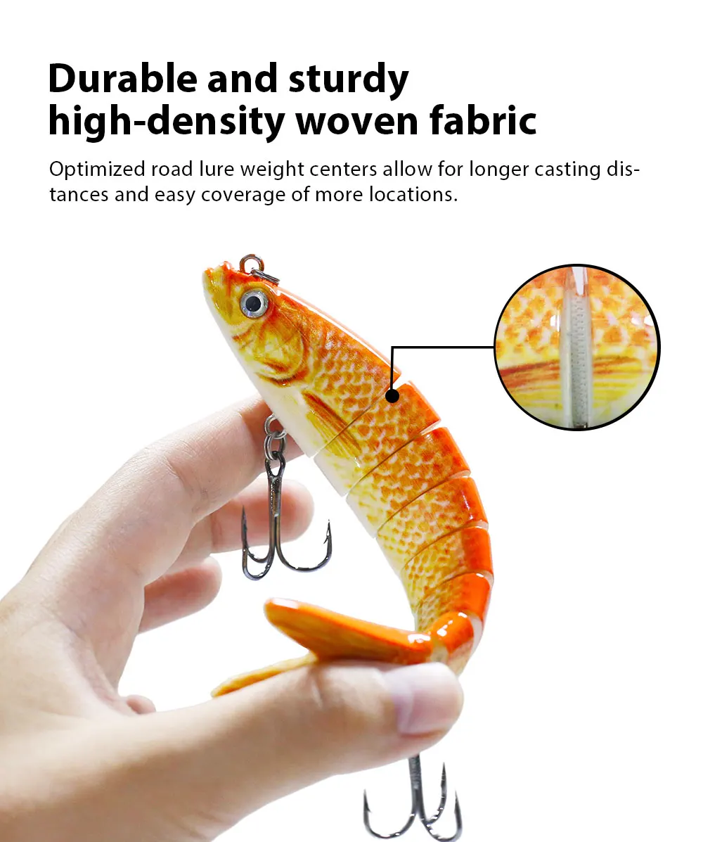 Este cebo duro multiarticulado es uno de los mejores accesorios de su caja de aparejos. Tiene una apariencia realista y puede crear acciones de natación realistas en el agua para provocar que el depredador muerda. Si eres un amante de la pesca, toma este señuelo de pesca y aumentará tus capturas y te brindará más diversión.