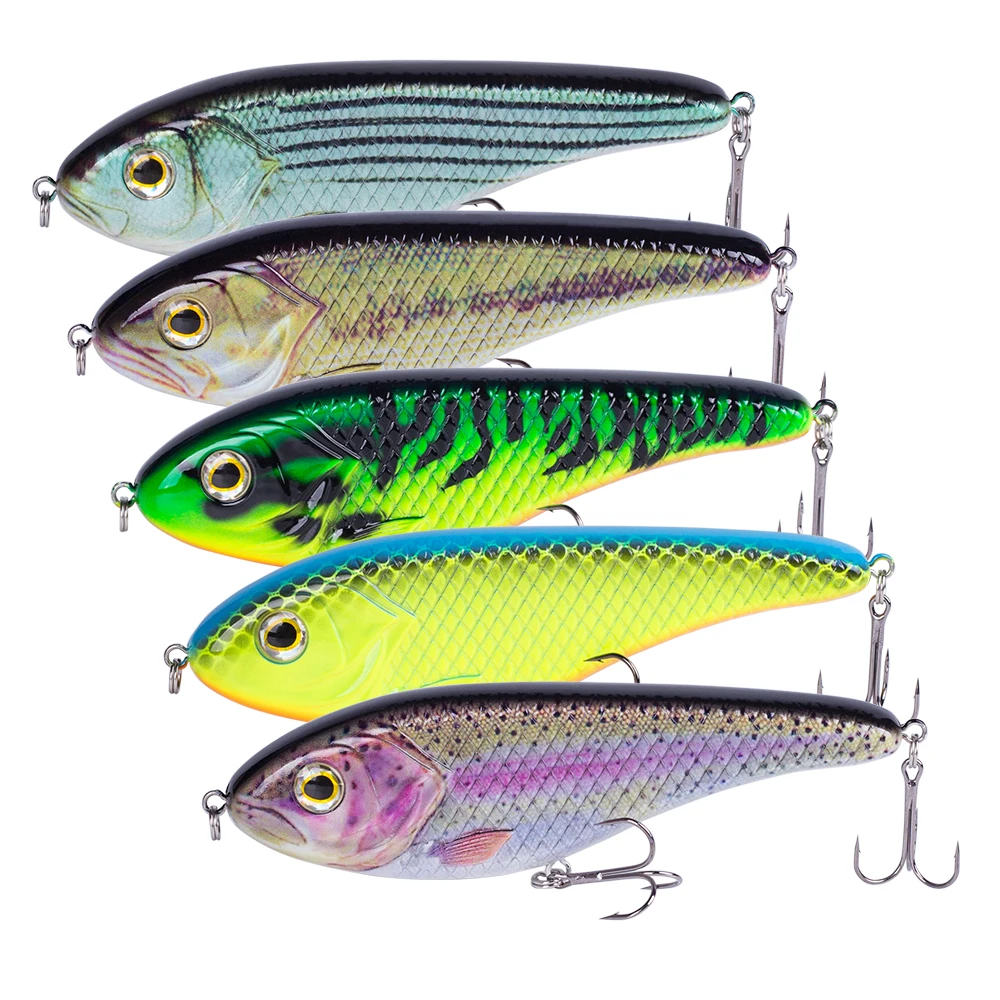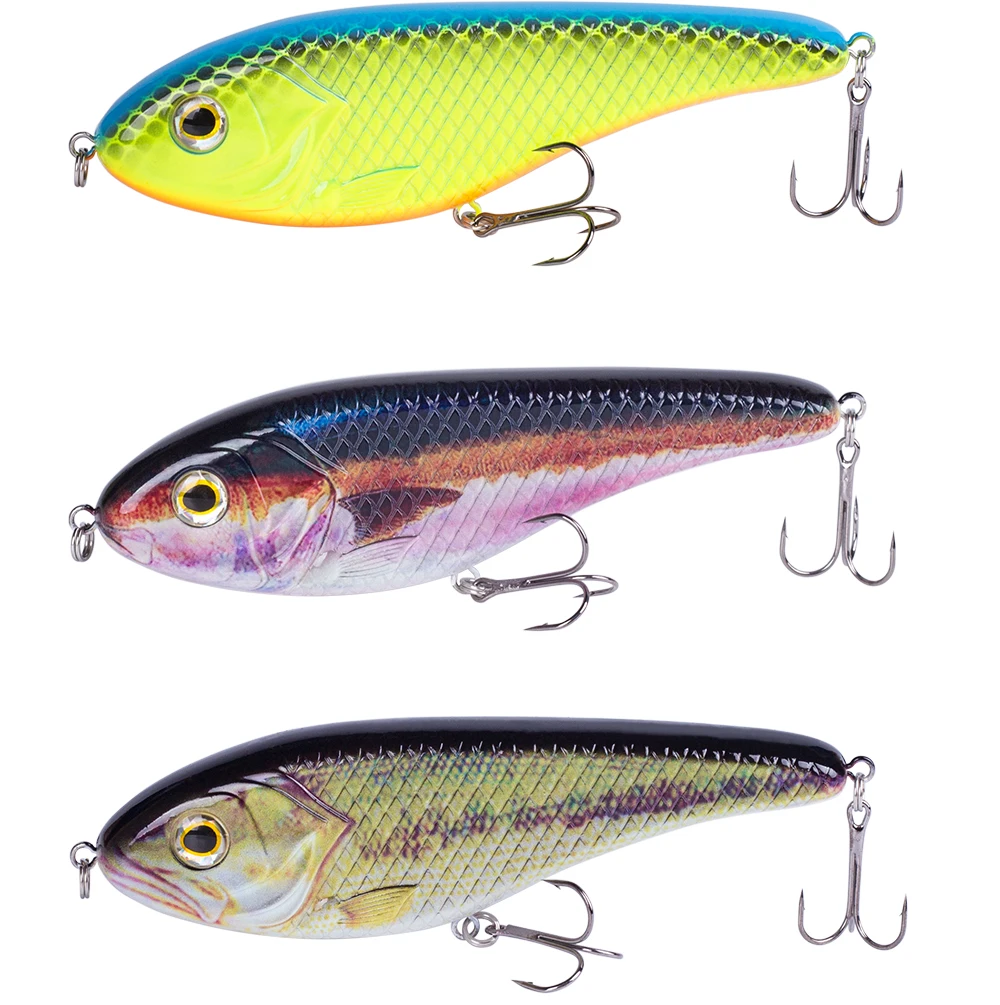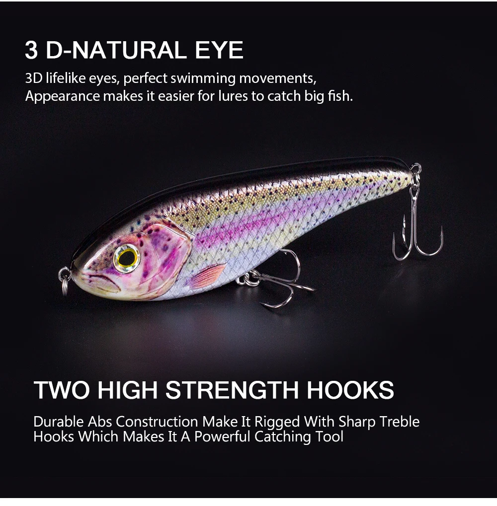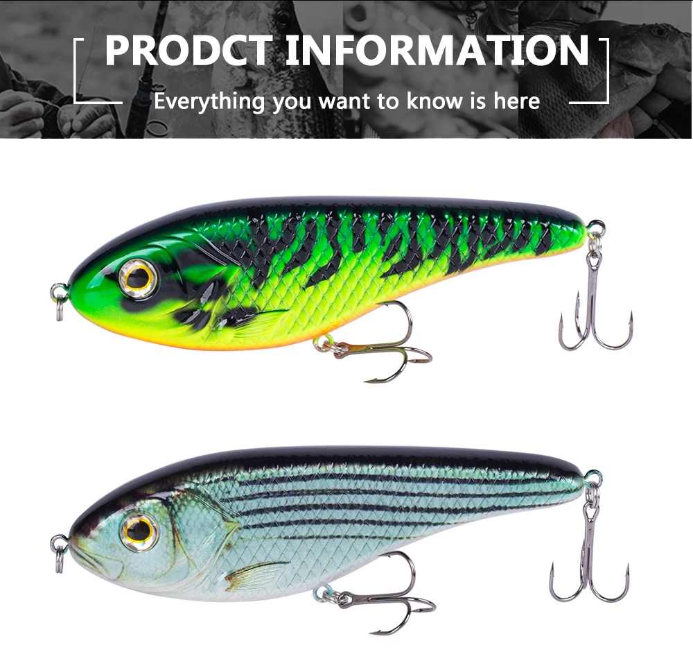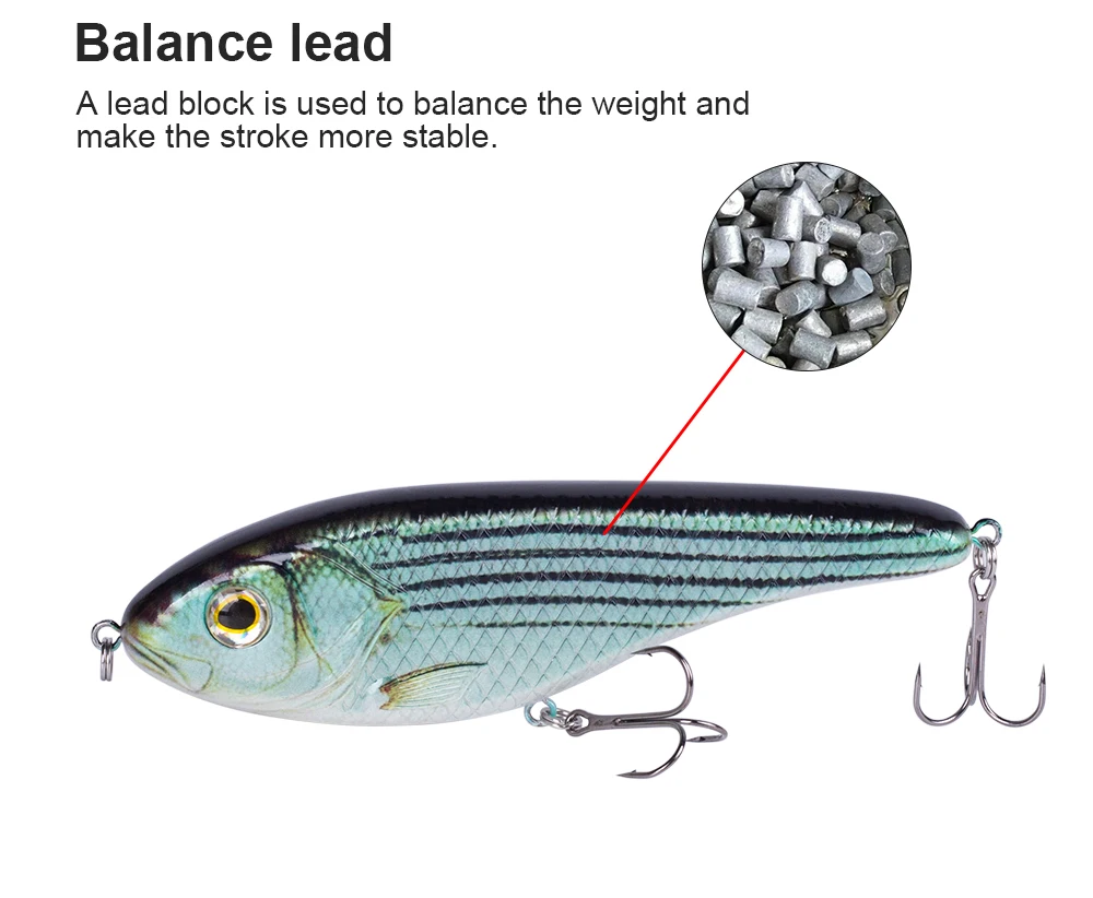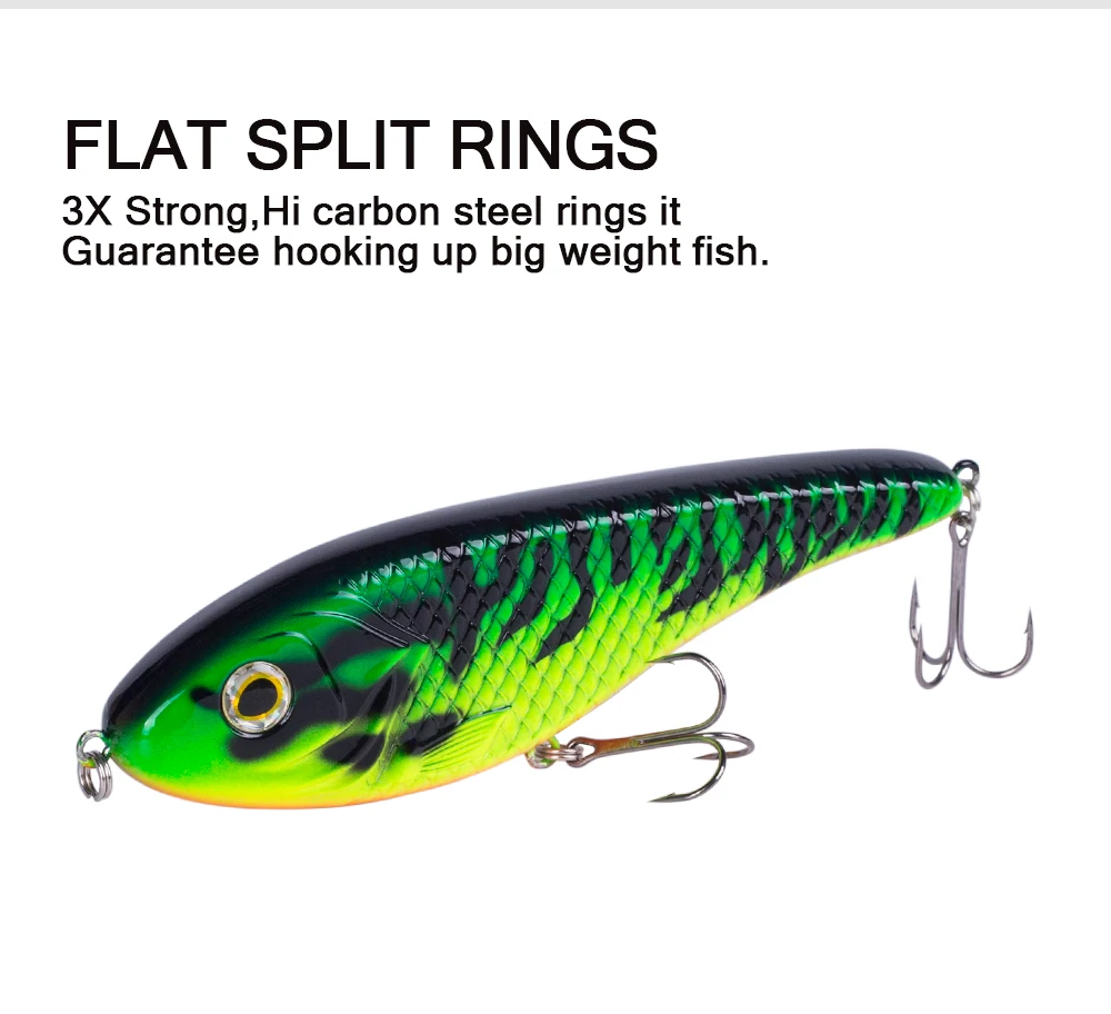 3) Estructura general: la estructura interna utiliza la bola de acero para equilibrar la conducción.Cuando toma la línea, la bola del cuerpo se transmite a otras partes y produce sonido, lo que puede hacer que el pez persiga.La forma está hecha de acero al carbono con 2 anzuelos triples súper afilados para garantizar que el pez no se escape.Esos Jerkbaits son ideales para capturar especies marinas y de agua dulce.