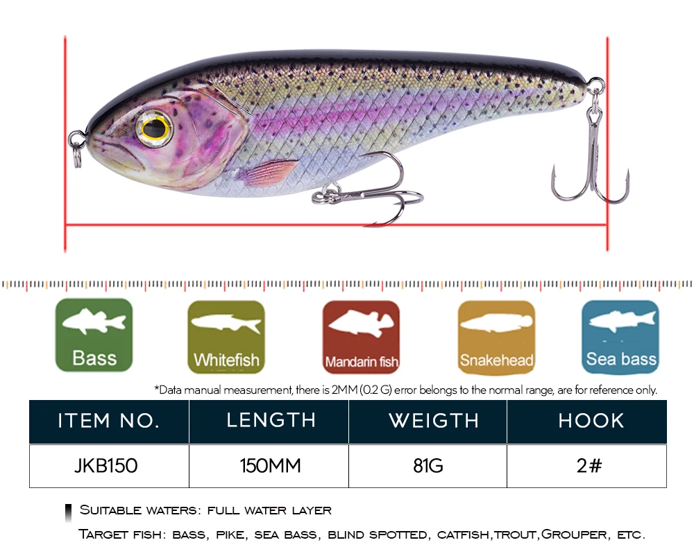 JKB100 slide jerkbait es el jerkbaits de mayor éxito desde hace años.La gran cantidad de especies de peces depredadores capturadas es notable.La relación precio-rendimiento equilibrada y la posibilidad de utilizar estos cebos en la caña giratoria también los hacen recomendables para principiantes.CONSEJOS: