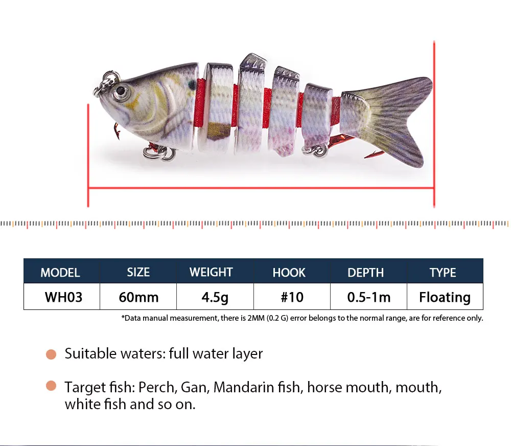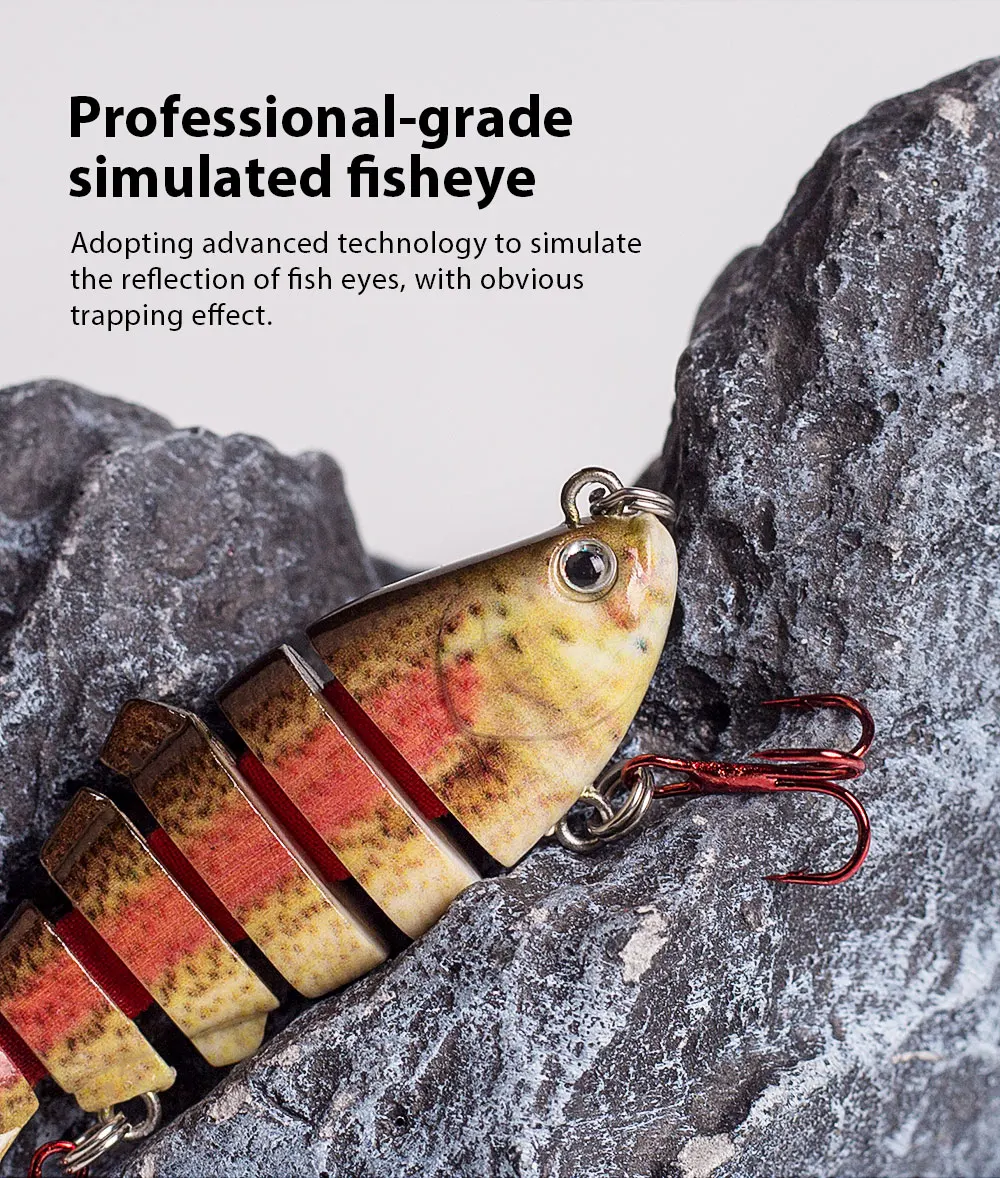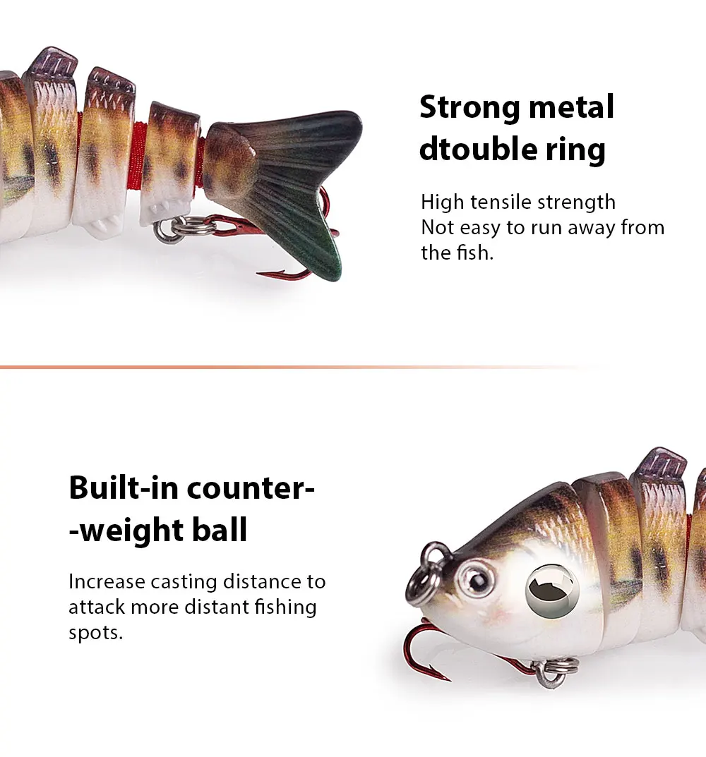 Este cebo duro multiarticulado es uno de los mejores accesorios de su caja de aparejos. Tiene una apariencia realista y puede crear acciones de natación realistas en el agua para provocar que el depredador muerda. Si eres un amante de la pesca, toma este señuelo de pesca y aumentará tus capturas y te brindará más diversión.